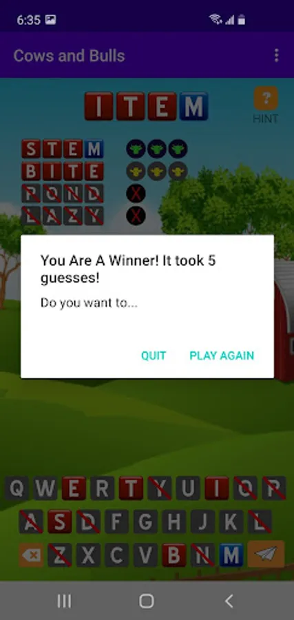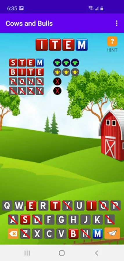 Allow the game to pick a word and challenge yourself to guess the word in as few attempts as possible. The game will let you know if your guess word has any right letters in the right positions (Bulls), right letters in the wrong positions (Cows), or invalid letters, and using the evaluation, you can strive to logically arrive at the right word.