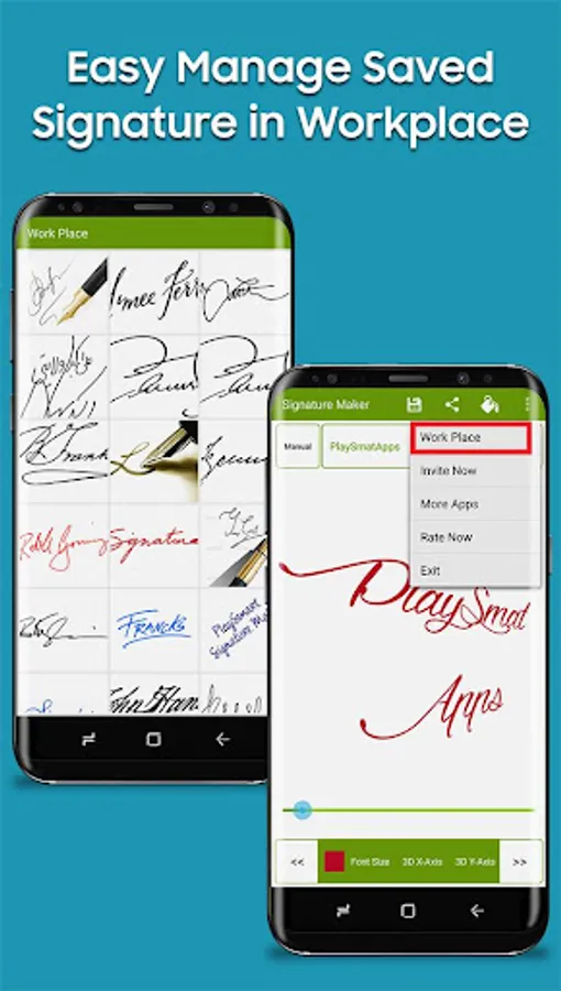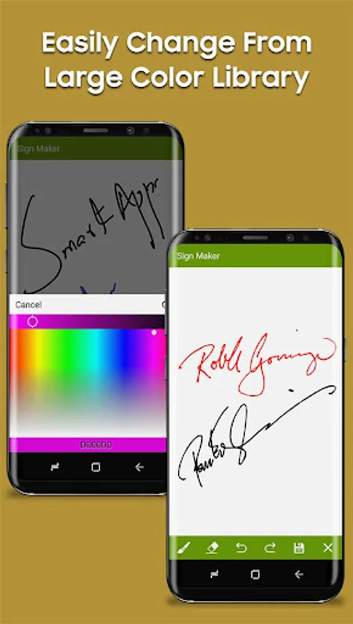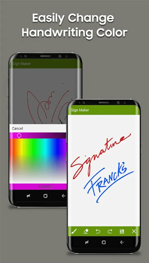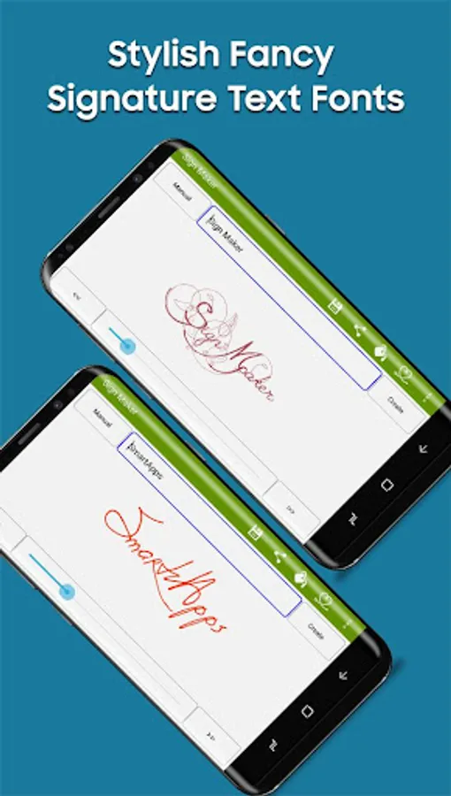 Fancy Signature Maker App will create a stylish signature. You need to pick a signature font, a signature style or design, color, size, and draw your signature by handwriting. When you need to show the result of writing text, tapping on the 'Create' button will create a distinctive style of signature. If the result looks great and if you want to save this signature image. You can also share the current signature image with your friends and family via social media, and much more.