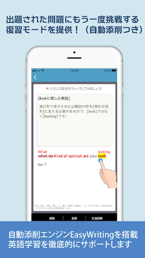 ・ In addition to correcting incorrect spelling, morphology, grammar, idioms, and word order, it also displays detailed explanations and grammar explanations.