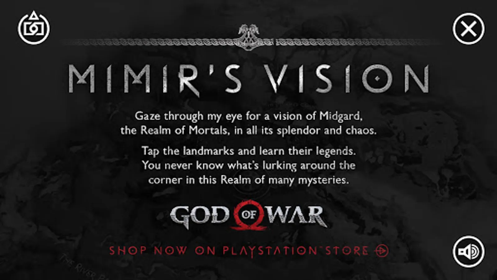Tap, zoom, and lock the map, then touch the points of interest to learn the lore behind this realm of many mysteries. Mimir, a man who’s seen it all, will guide you from The River Pass to The Mountain Peak, giving you a first look at this strange and foreboding world.