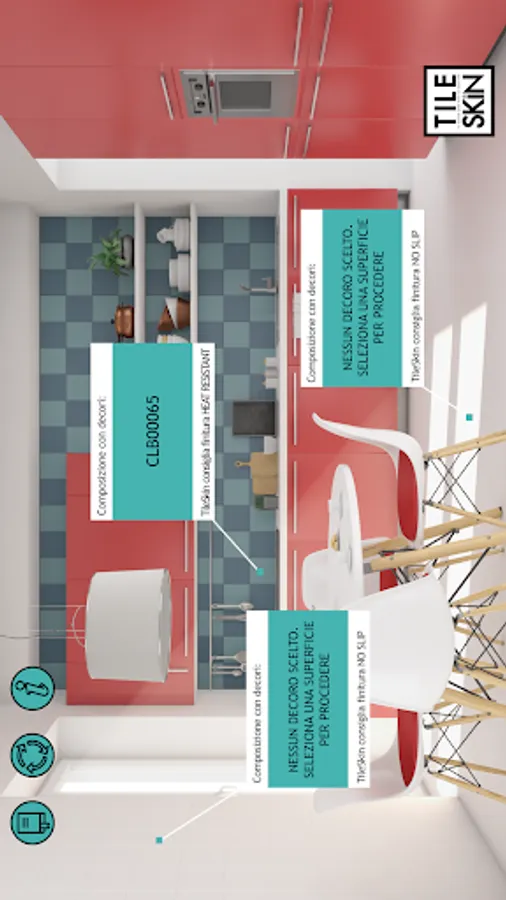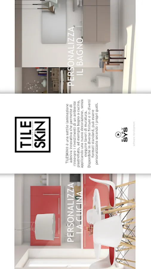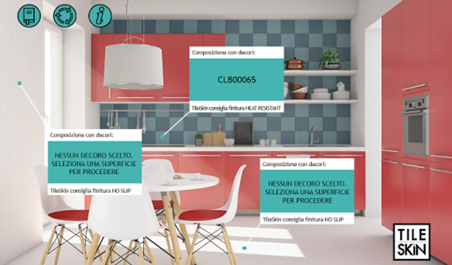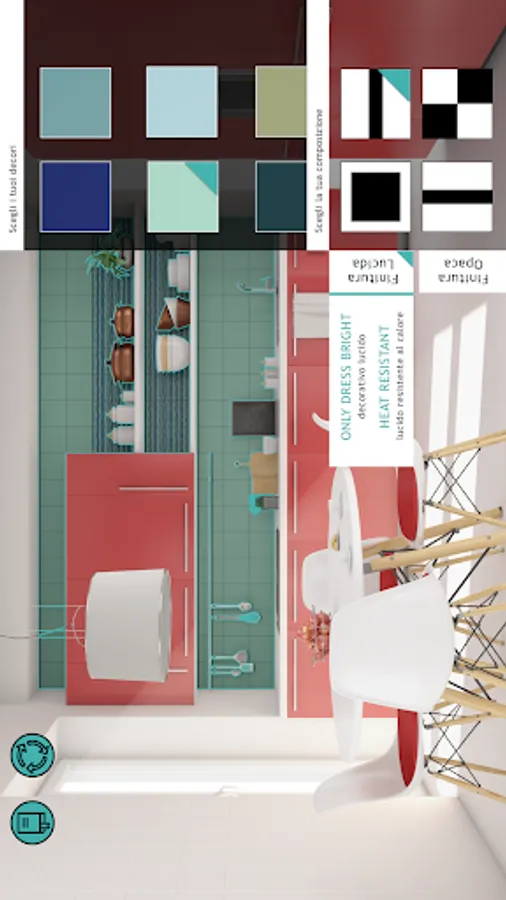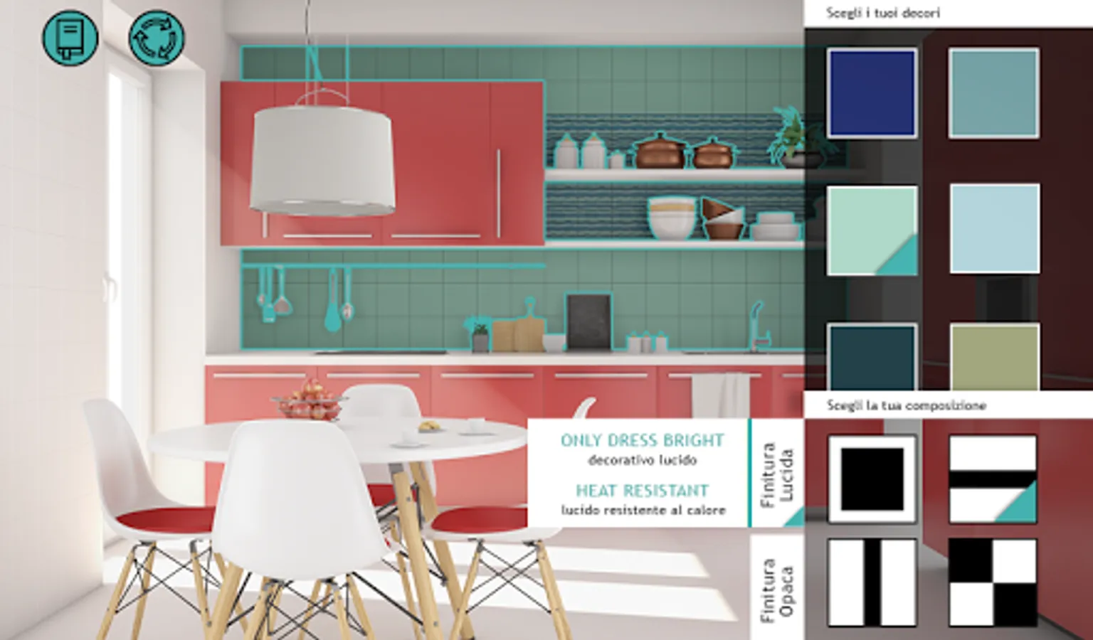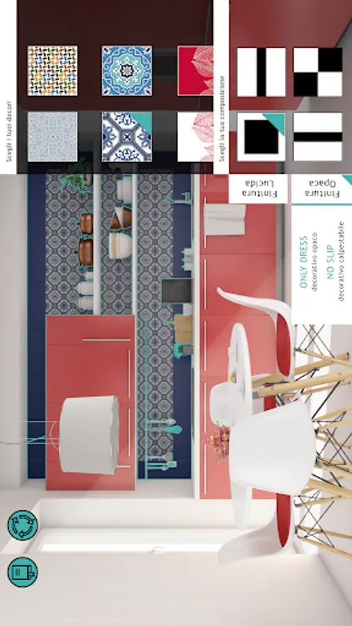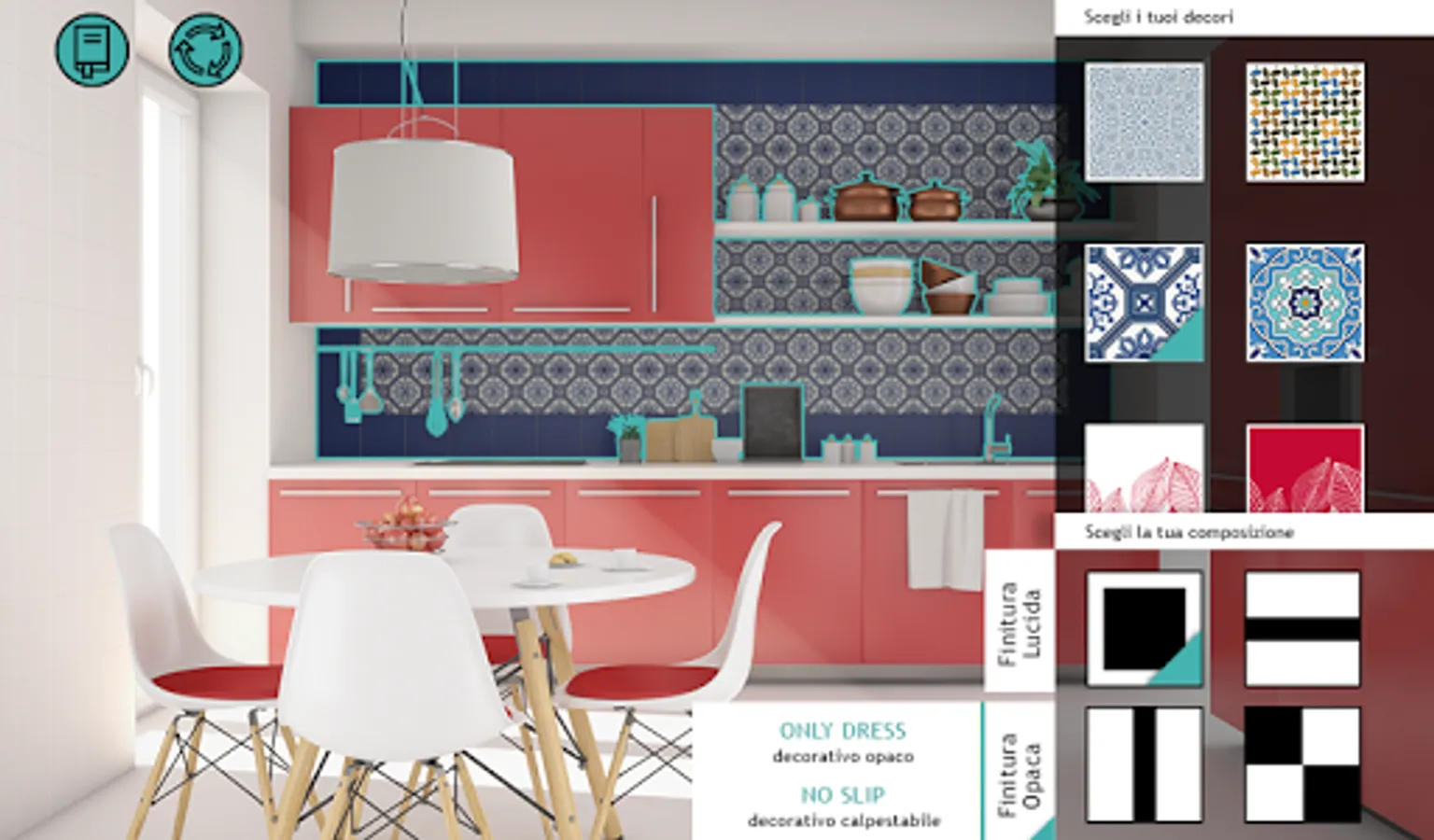 Are you confused by choosing from many types of decorations? With this intuitive App you can try them in virtual environments and express your creativity. Customize a kitchen or bathroom, applying to walls and floors different colors, graphics and finishes. Select different compositions of decorations for your surfaces. Save your favorite combinations complete with a summary of your choices.