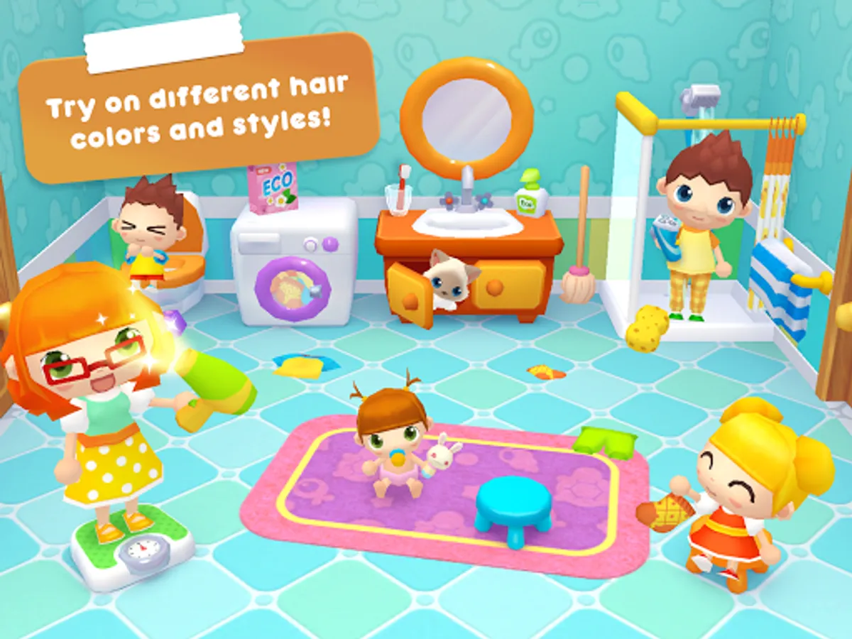 Join a family of 6 lovely characters in their day to day life and create your own home stories. Play, explore and have fun doing funny chores in this cozy house: Make tasty meals, diaper the little baby, dress the kids, brush their teeth in the morning, or read to them before sleeping at night.