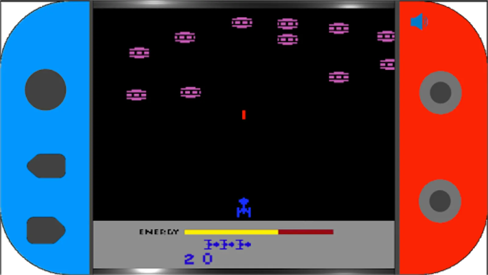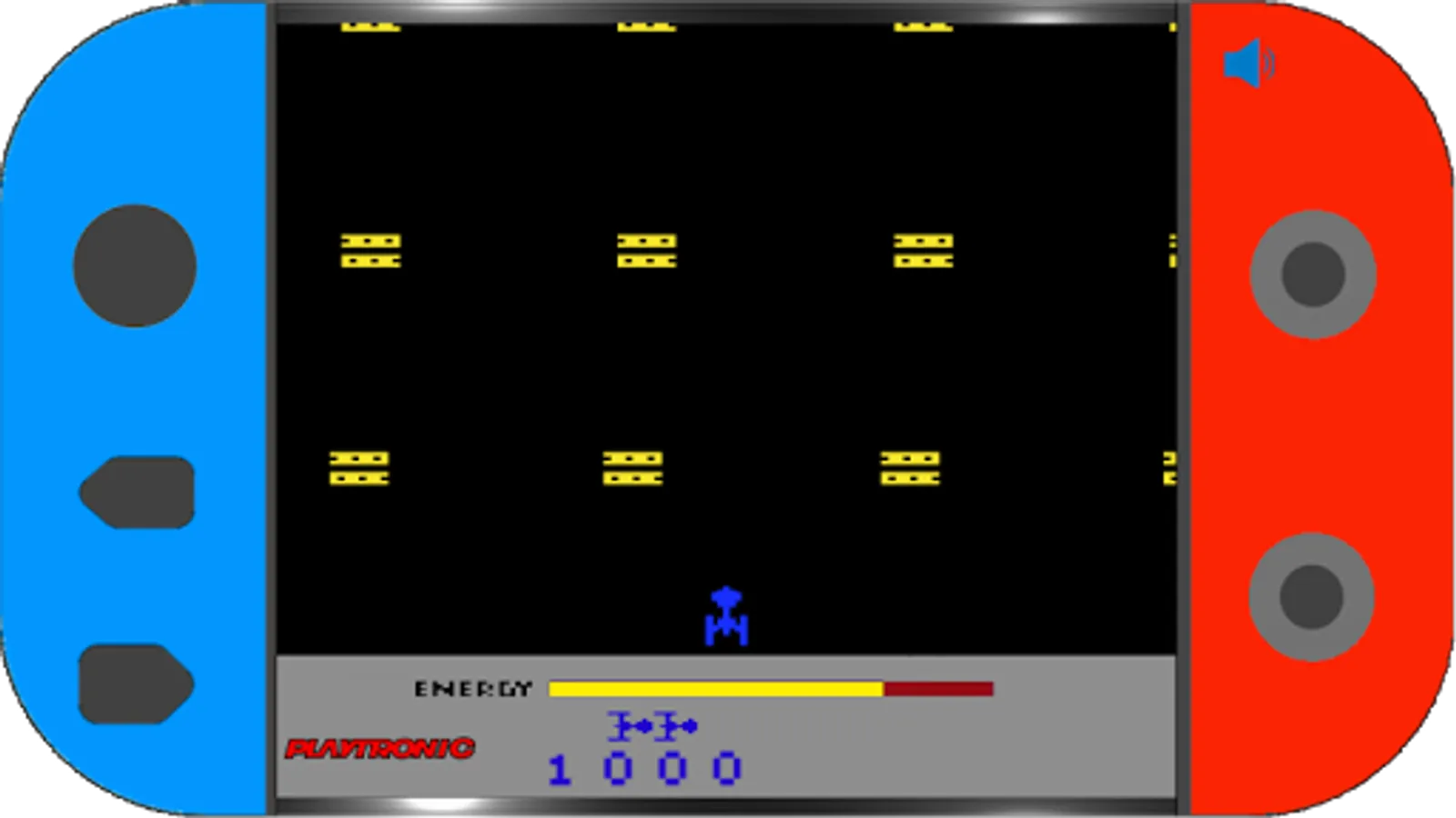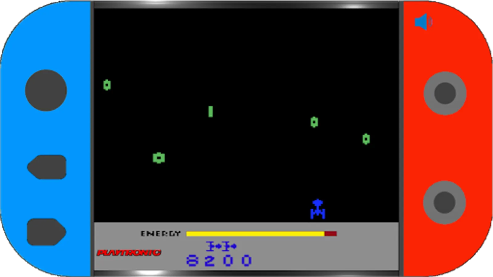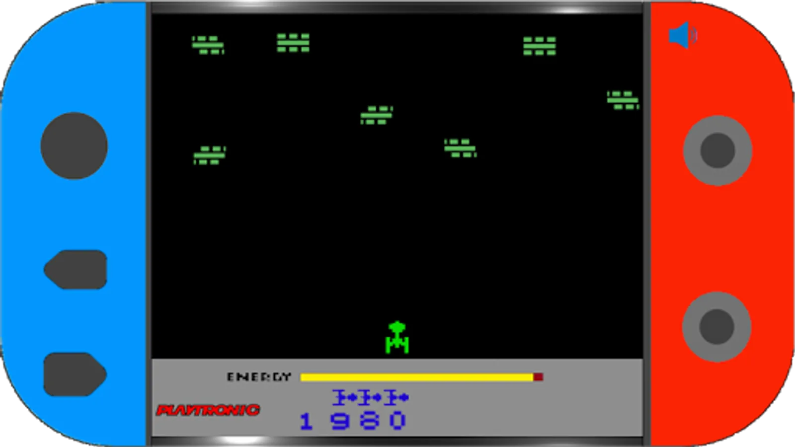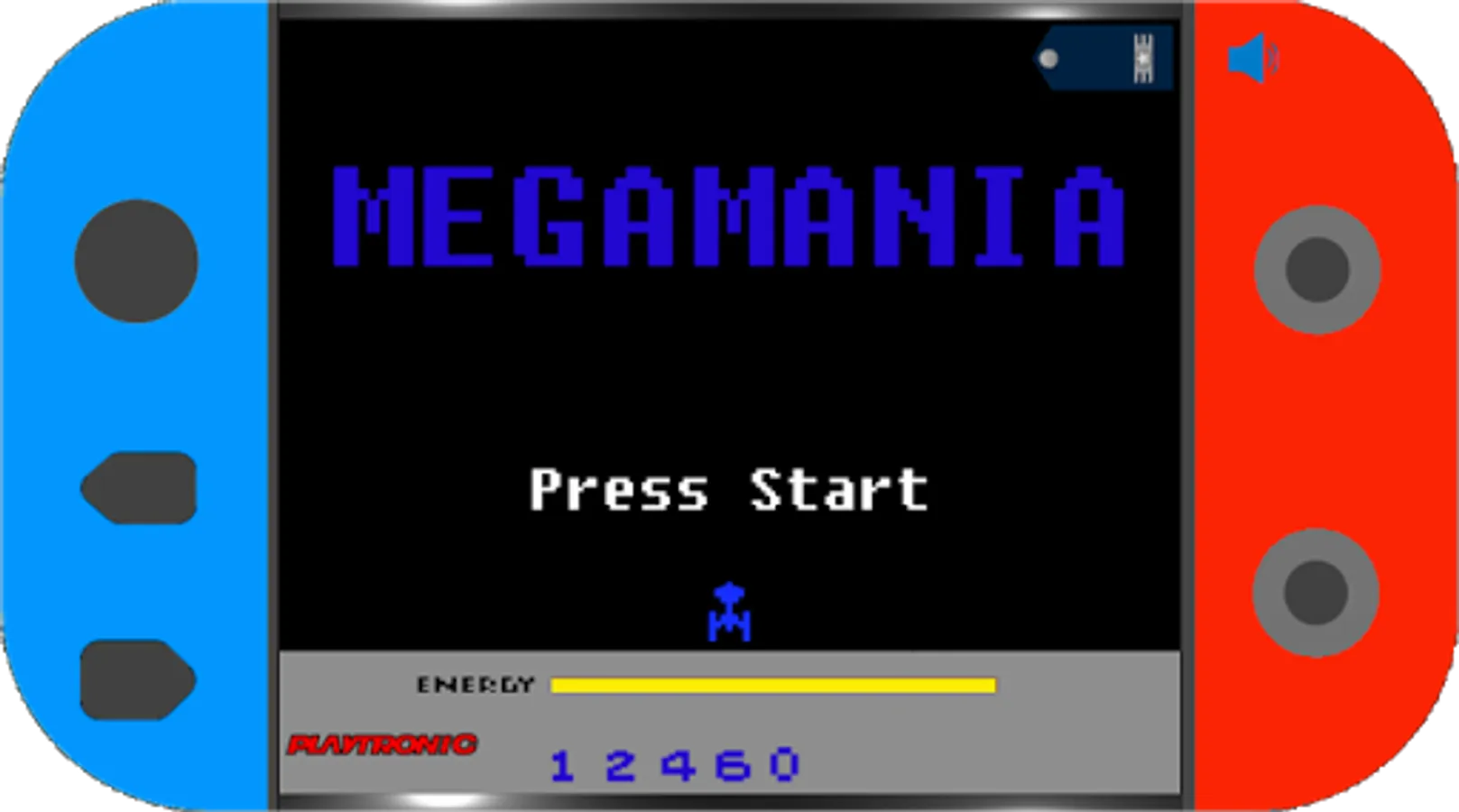 Megamania is a remake of its 1982 namesake. In this game, the player controls a ship that moves across the bottom of the screen. At the top, various types of enemy ships shoot slowly down toward the player's ship. In the Playtronic version, in addition to destroying as many enemy ships as you can, you need to accumulate points to increase your aeronautical rank.