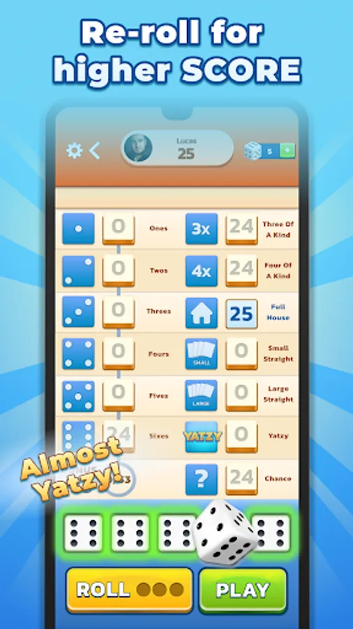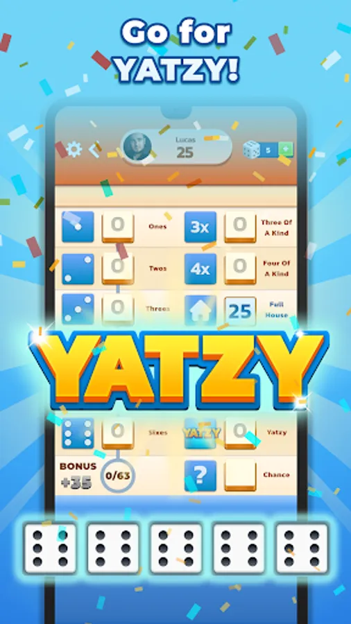 Looking for a free online dice game to play alone or with your family and friends? Whether you call it Yatze, Yatzi, Yatzee, or Yahtzee, this Yatzy app is the best classic dice game for testing your luck and strategy skills. 🎲 Roll the dice now to see if you can score BIG with a lucky Yatzy! 🎉