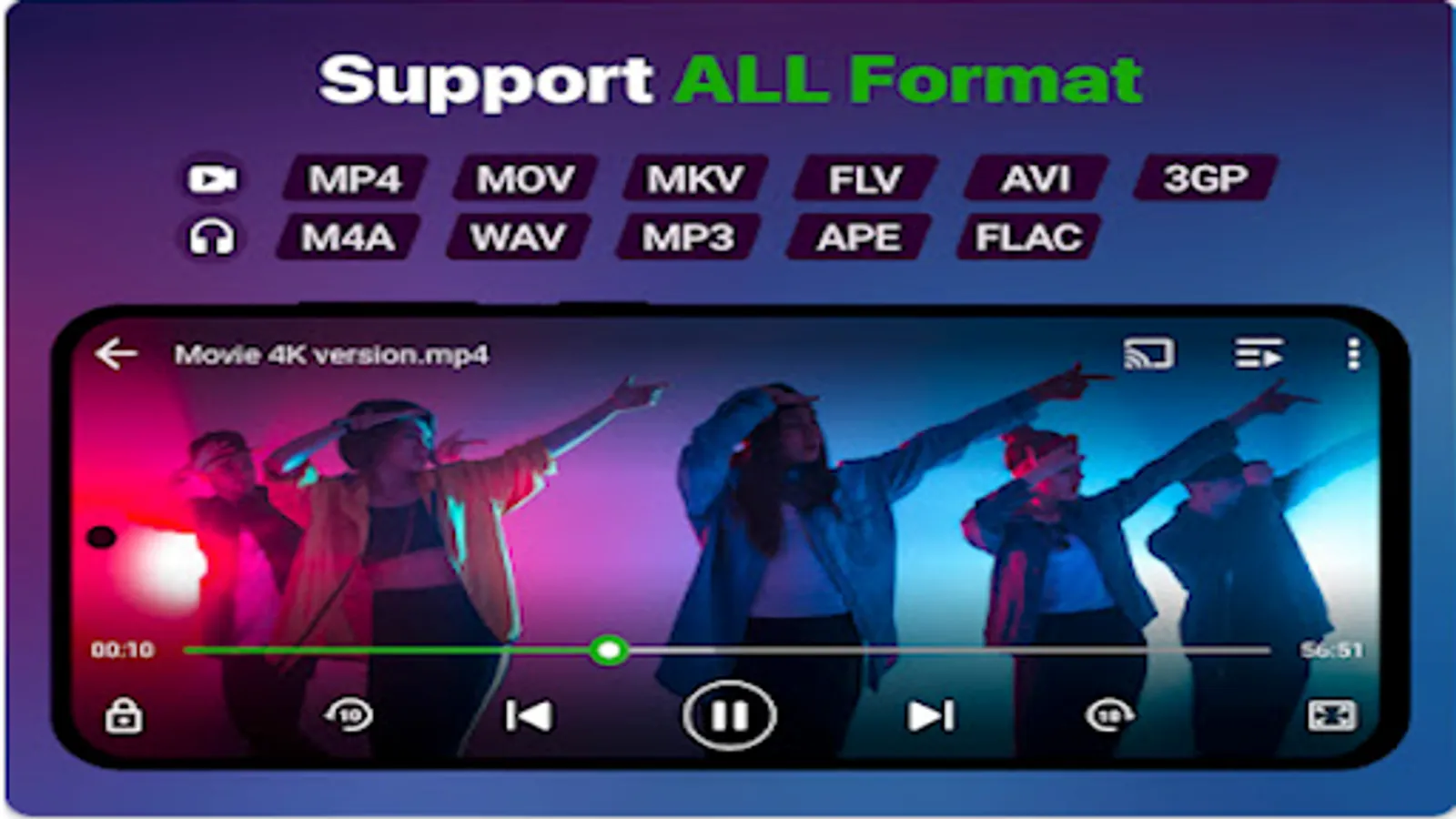 Play all video formats, including MKV, MP4, M4V, AVI, MOV, 3GP, FLV, WMV, RMVB, TS, etc.