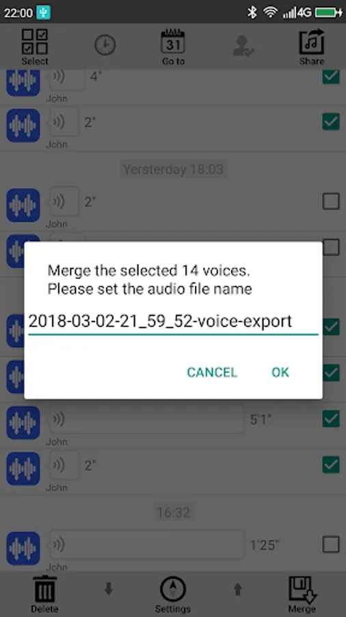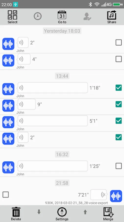 Voice is frequently used in Line messenger. Each voice is a separate file. This app is developed to export voice. It also can merge multiple voice to a single m4a/aac audio file. In this app, all voices are displayed and can be played or shared. User can select one voice or multiple voices and export or merge to a m4a/aac audio file. The audio file can be played in music player or be saved in computer/cloud.