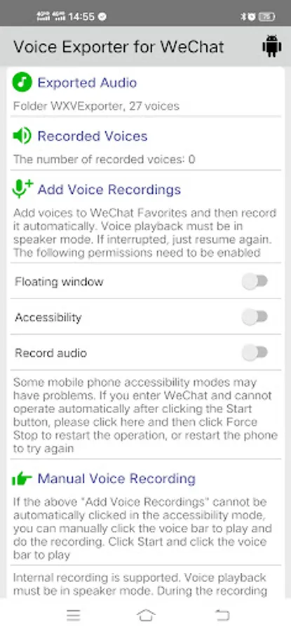 This app uses Accessibility Service to complete its functions. During the recording of voice, the Accessibility Service will help to automatically click the voice bar. You can also choose not to use Accessibility Service, then you can click the voice bar manually, and do the recording.