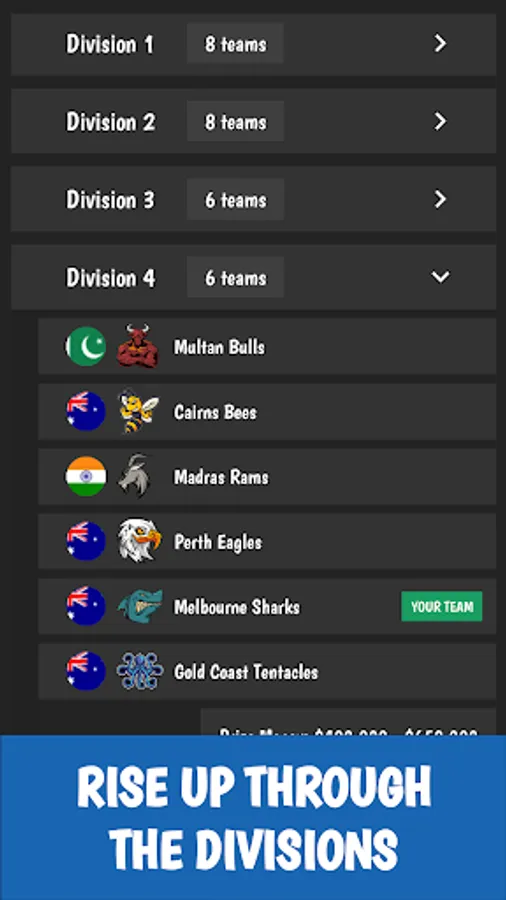 Your club will start off at the bottom division. Show off your cricket management skills by getting promoted & taking your club to the very top. There are 6 divisions & the game gets progressively harder as you go along!