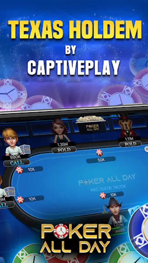 Don’t settle for the all-in poker fests in OTHER social poker games! Play the best online poker games and aim for the royal flush with PokerAllDay Poker, the best Vegas-style poker app that brings authentic Texas Hold’em poker to your hands.