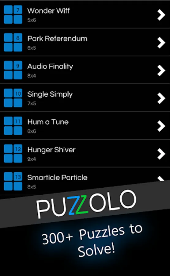 Solve brain twisting word puzzles with Puzzolo. Arrange puzzle pieces to solve each level. Puzzle pieces can be moved and rotated. Puzzolo starts out easy but quickly becomes very challenging. Can you solve them all?