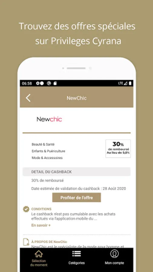 Cashback is the reimbursement in euros of part of your purchases made at one of our merchant partners. It is presented as a percentage of the amount of your order. With each purchase, you accumulate euros reimbursed in your Cyrana Privilege kitty. Example: you buy a dress at 100 € excluding taxes on the merchant's site, through the cashback of the Program, you accumulate 4 € in your kitty!