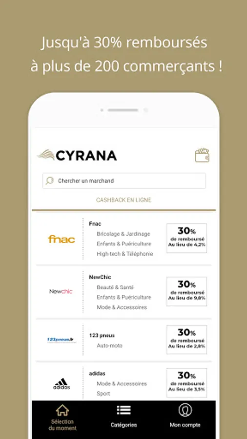 The application is reserved for Cyrana members and gives you up to 20% cashback at more than 1,000 merchants such as: Booking, Fnac, Darty, Asos, La Redoute, Hotels.com, Sarenza… It also allows you to benefit promotional codes and good deals on these partners!