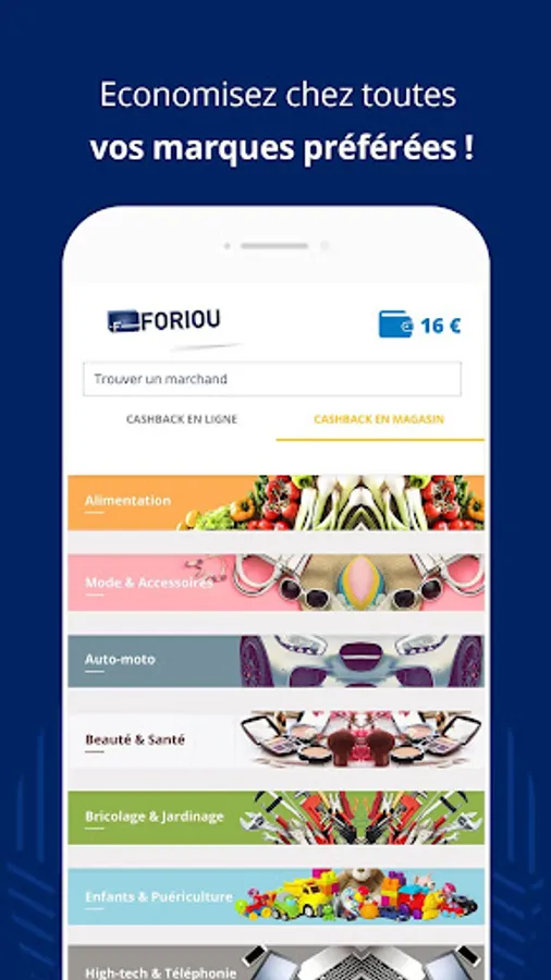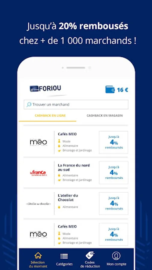The application is reserved for Foriou members and gives you up to 20% cashback at more than 1,000 merchants such as: Booking, Fnac, Darty, Asos, La Redoute, Hotels.com, Sarenza ... It also allows you to benefit promotional codes and tips on these partners!