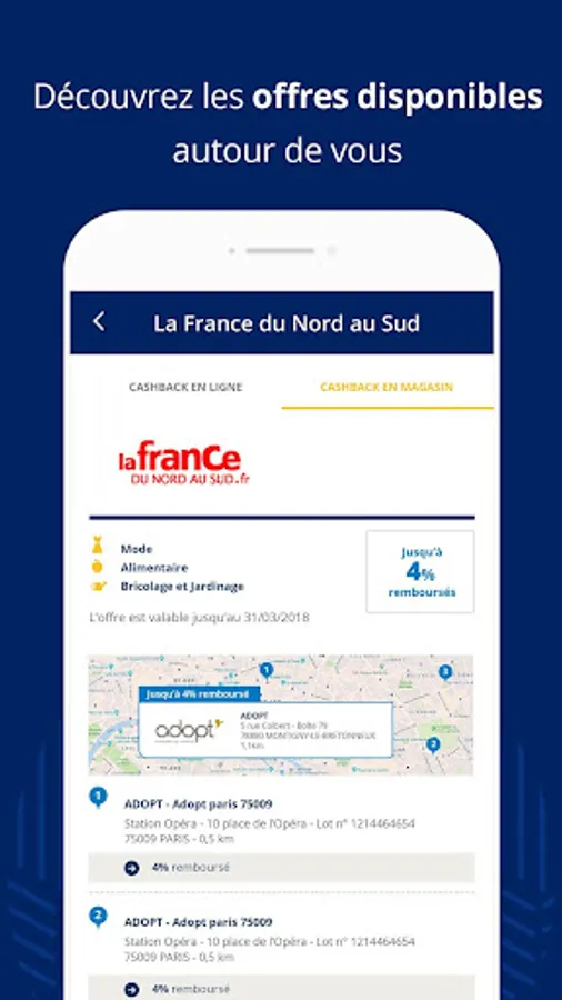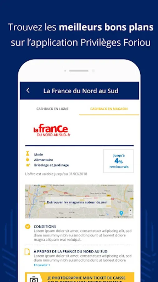With the Privilèges Foriou app, also discover the offers in the stores around you thanks to geolocation! Likewise, you activate the offer and benefit from cashback in the shop. Then you just have to photograph your receipt and send it to us by email directly via the application.