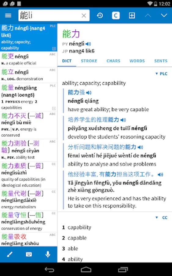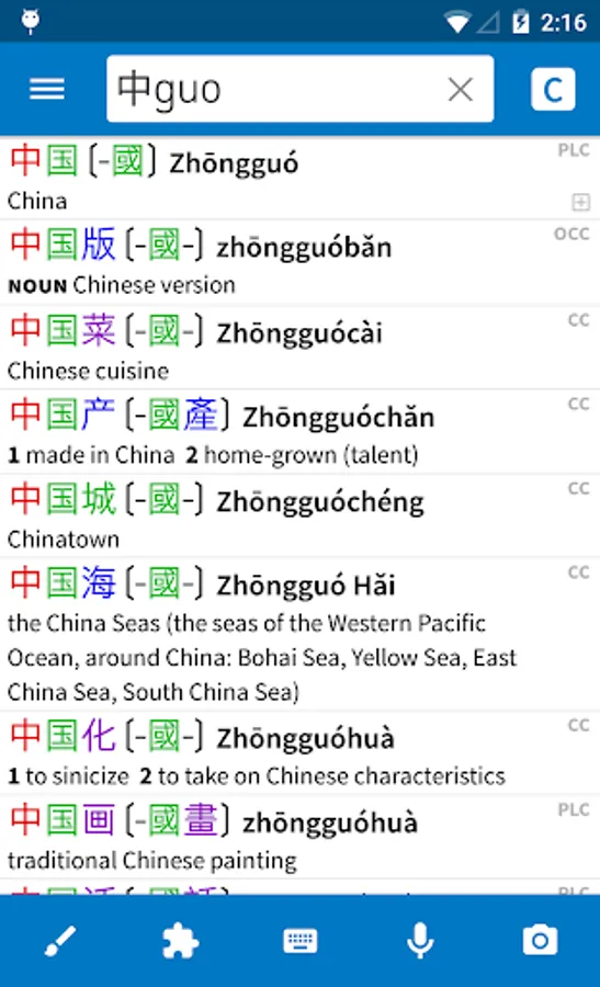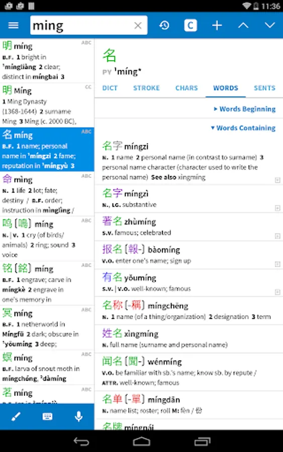 • Powerful search: look up words by Chinese characters, Pinyin (spaces/tones optional), or a combination, with support for wildcards and full-text search.