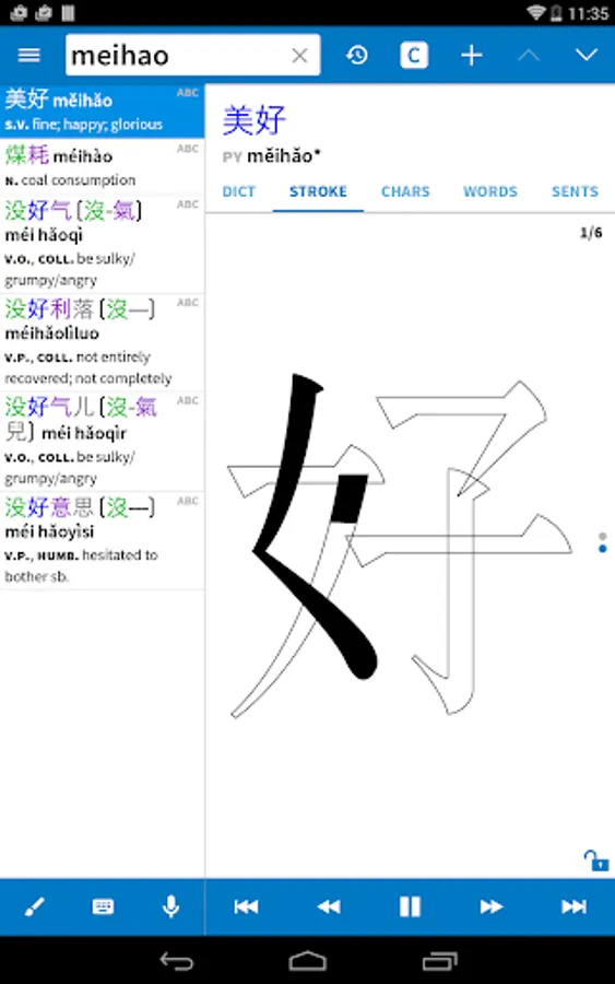 • Stroke Order Diagrams: animations showing you how to draw each Chinese character; 500 in free app, 28,000 in paid add-on.