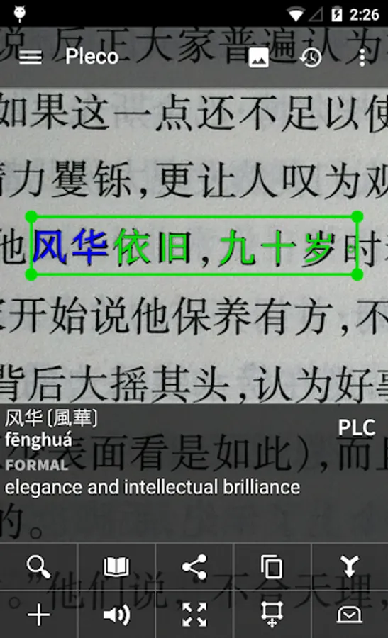 • Live Optical Character Recognizer (OCR): look up Chinese words in the dictionary simply by pointing your device's camera at them, or by scrolling around a still image. ($)