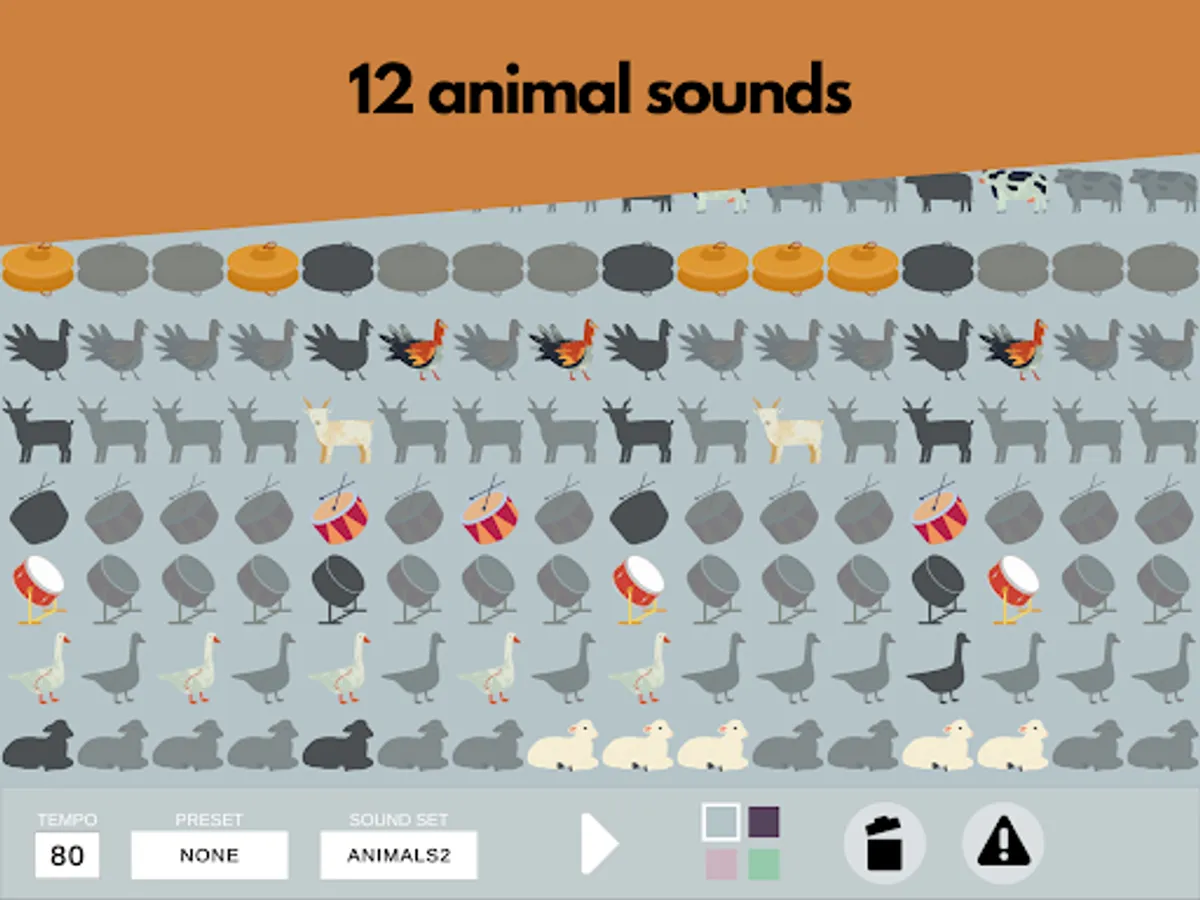 This Drum machine contains 12 animal sounds and 3 drum and cymbal sounds.
