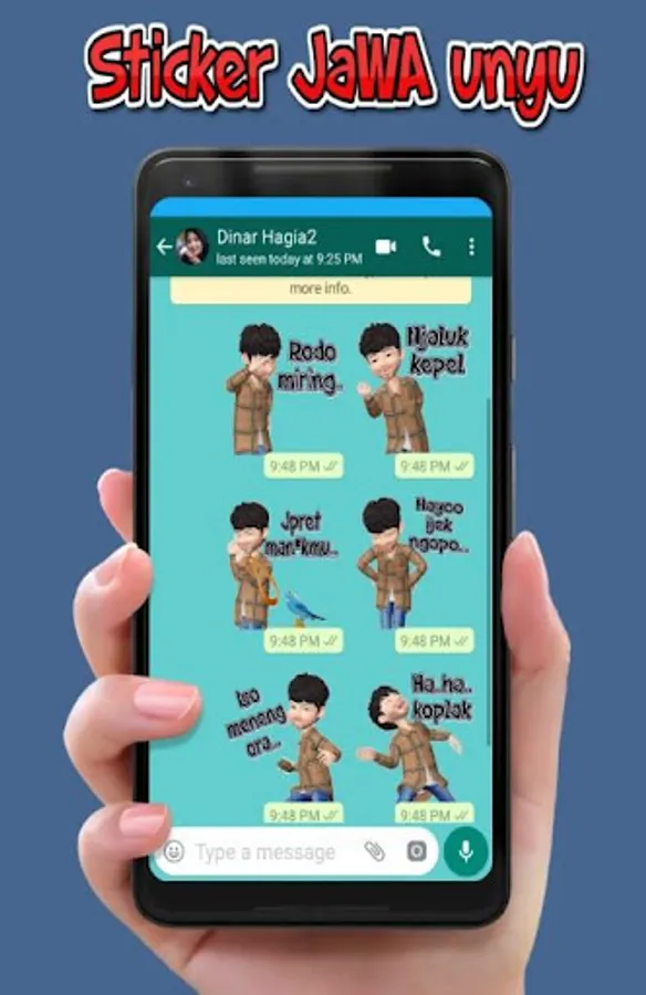 Funny and hilarious stickers present to decorate your chat. Offering free hundreds of stickers with quite familiar languages we hear or we see in every WAstickerApp chat. In the application, you have 90 stickers for the Latest Funny Stickers and 30 Stickers for Indonesian Language Learning. Among them there are also Stickers Jowo Misuh but still within the scope of language that emphasizes modesty values. The size of each Sticker is very light (below 100kb) and allows it to be sent faster without draining the internet quota.
