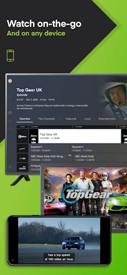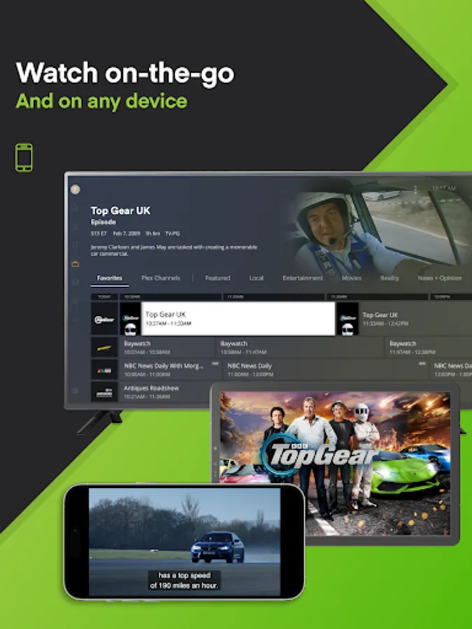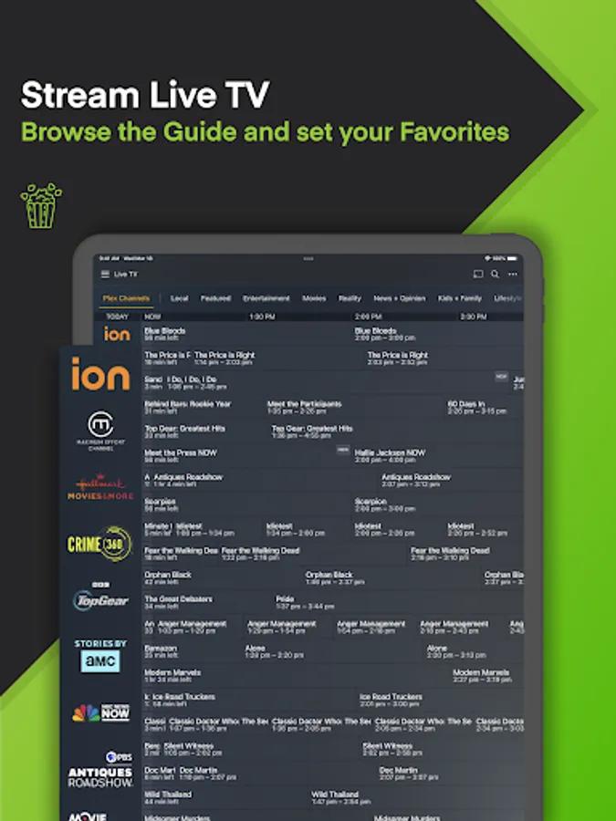 Free live TV is just a tap away with Plex. Dive into over 600 TV channels such as The Hallmark Channel, BBC Top Gear, PBS Antiques Roadshow and more! Stream TV favorites like The Walking Dead Universe, Ice Road Truckers, Game Show Central, and NBC News Now when you download.