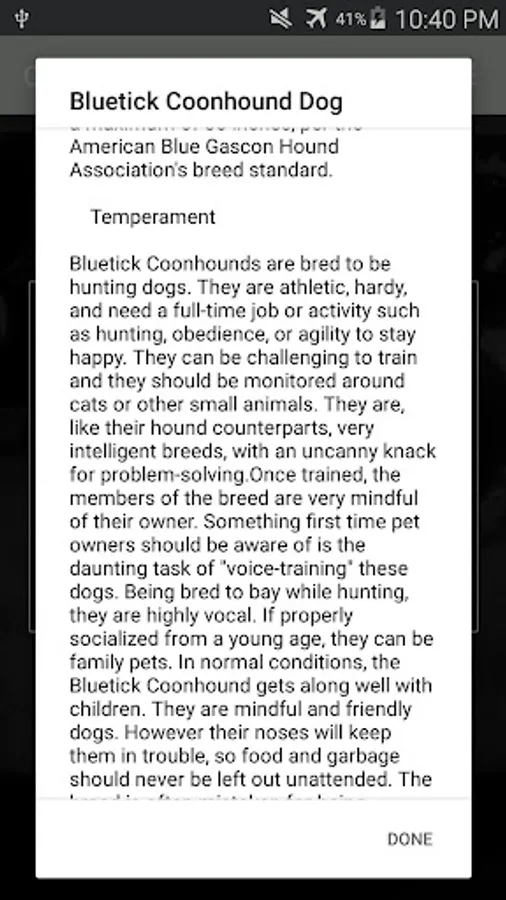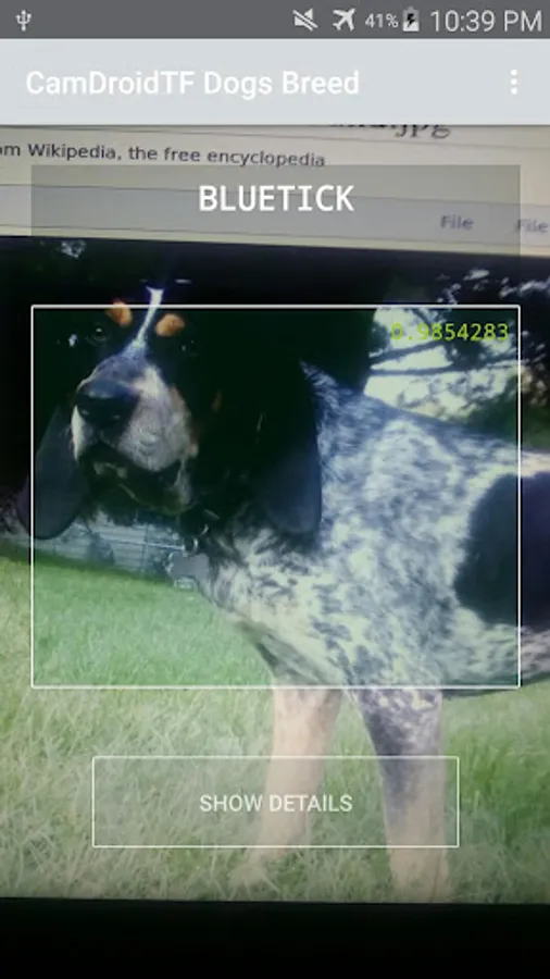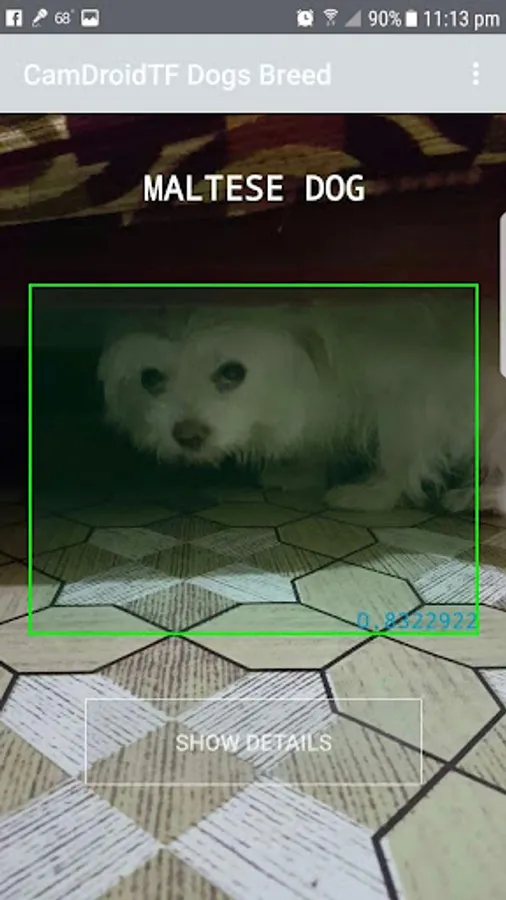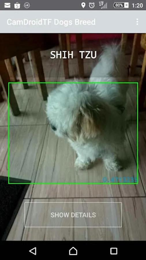 Usually many people don't know much about their own dogs. This app help them to know more details about it. History, Health care, character and behavior, etc. anything related with the dog particular breed. - How to use it? Try to hold the camera still, don't move while aiming a dog and wait until the rectangle's lines gets green and the blue number gets as closer to 1.0 as possible. This number is the level of confidence. Wait for a few seconds, at this point it's trying to get the best guess. It may change a few times from different breeds until it gets stable and the number of confidence reaches the highs score possible.