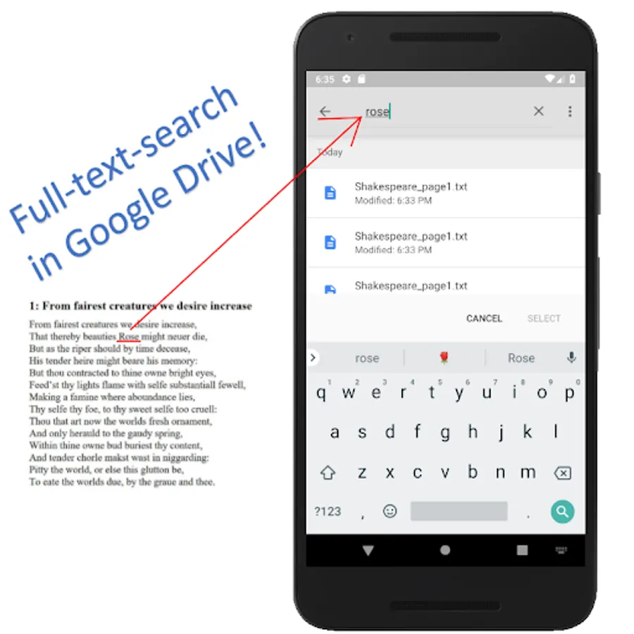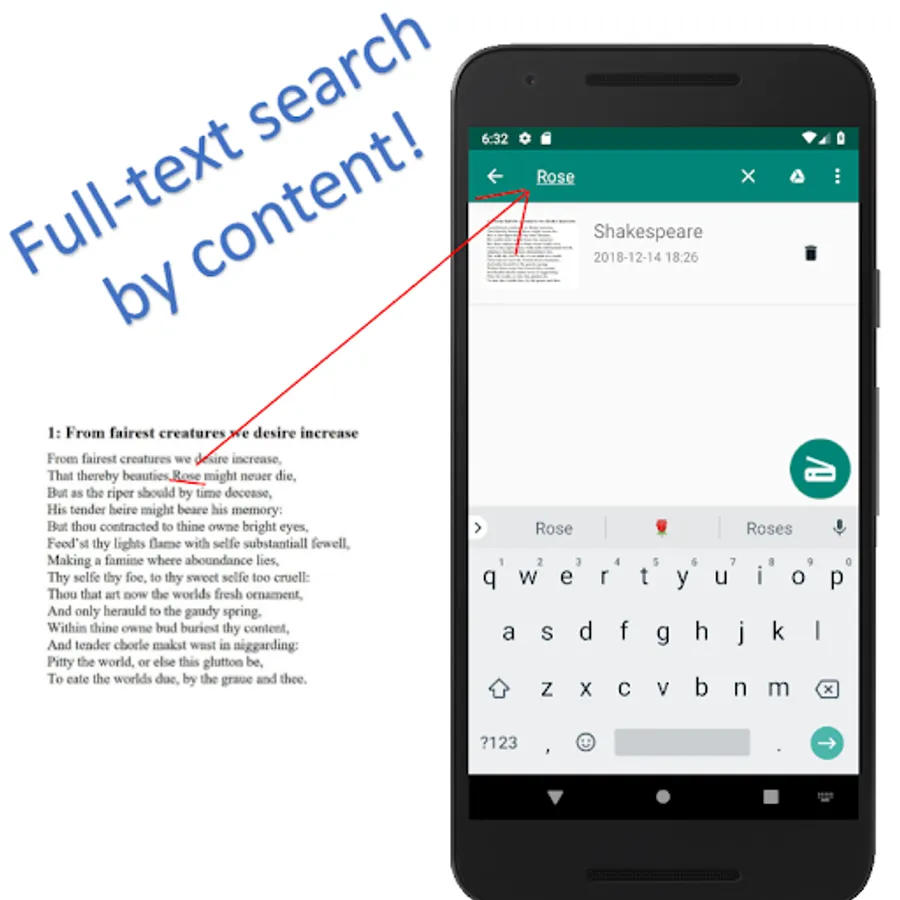 - Full-text search, both locally and in Google Drive, thanks to the extracted text by OCR.