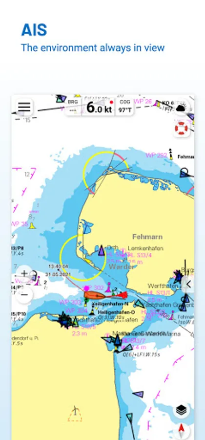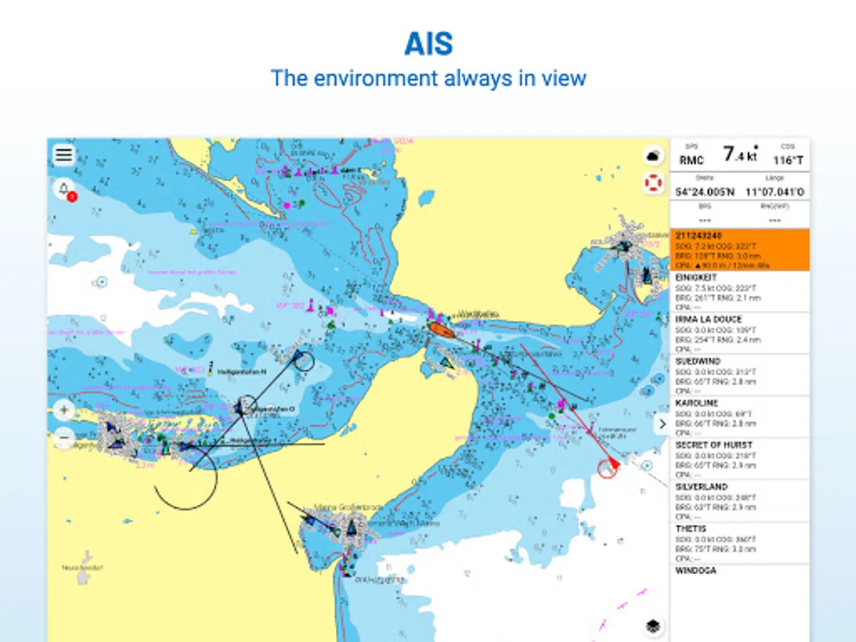 With the AIS function in the NV Charts App you can keep an eye on AIS signals in real-time. You can connect a Wlan AIS receiver to the NV Charts and the app display AIS Class A and B signals and navigation aids (ATON), as well as MOB AIS SART transponder distress transmitters, directly in the digital chart in real-time and the traffic situation can be assessed better.