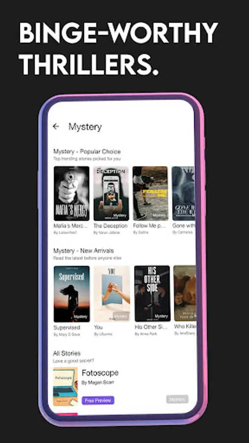 New stories every week! Horror, romance, steamy, drama and mystery categories updated with new stories every week.