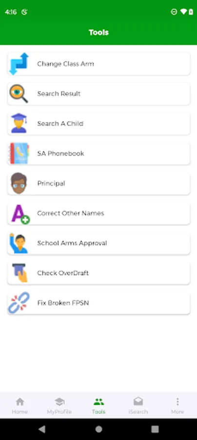 The app encompasses a range of commonly utilized tools by our helpdesk staff, including functionalities such as changing class arms, searching student results, correcting names, accessing principal listings, and utilizing the SA Phonebook.