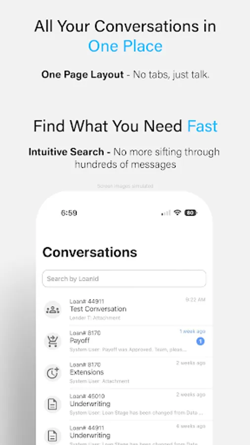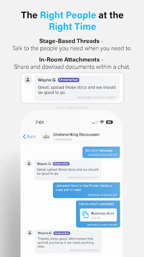 - Use stage-based threads to communicate with the right people at the right time (Underwriting Room, Closing Room, Draws Room, etc.)