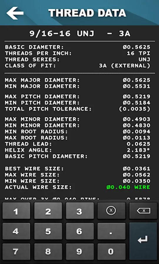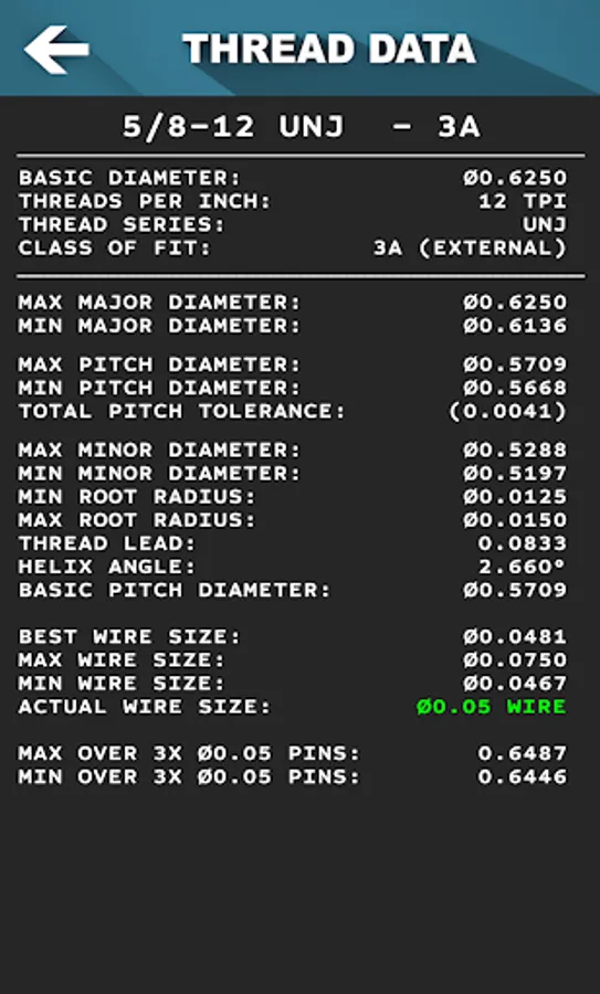 Get thread pitch, major, minor, root radius, helix angle, and more for 60° threads. Shows min and max wire sizes for checking each thread and shows the correct measurement over pins for whatever wire size you choose.