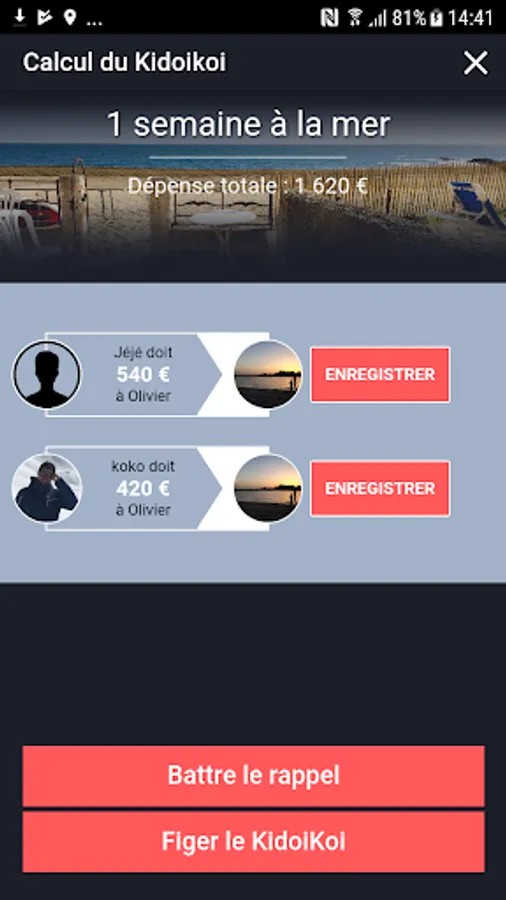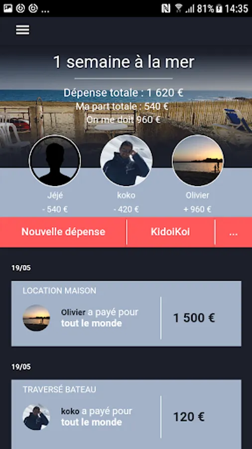 KidoiKoi is used collaboratively: each participant may declare his expenses. At the end, you just automatically calculate the KidoiKoi and you know that very simply must pay what to whom.