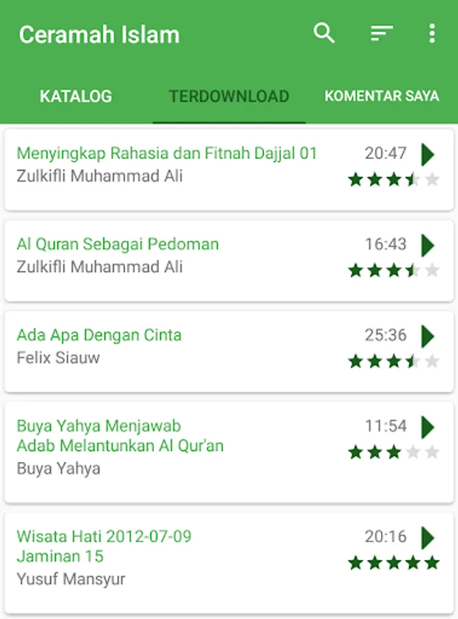 Katalog ceramah mengenai Islam dari ustadz ternama Indonesia seperti Ustadz Yusuf Mansur, Aa Gym, Aam Amirudin, Zulkifli Muhammad Ali dan banyak lagi.
