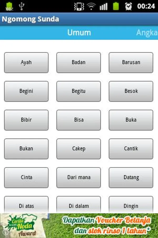Klik tombol kata/phrase/kalimat maka akan muncul terjemahan dan suara dalam bahasa sunda.