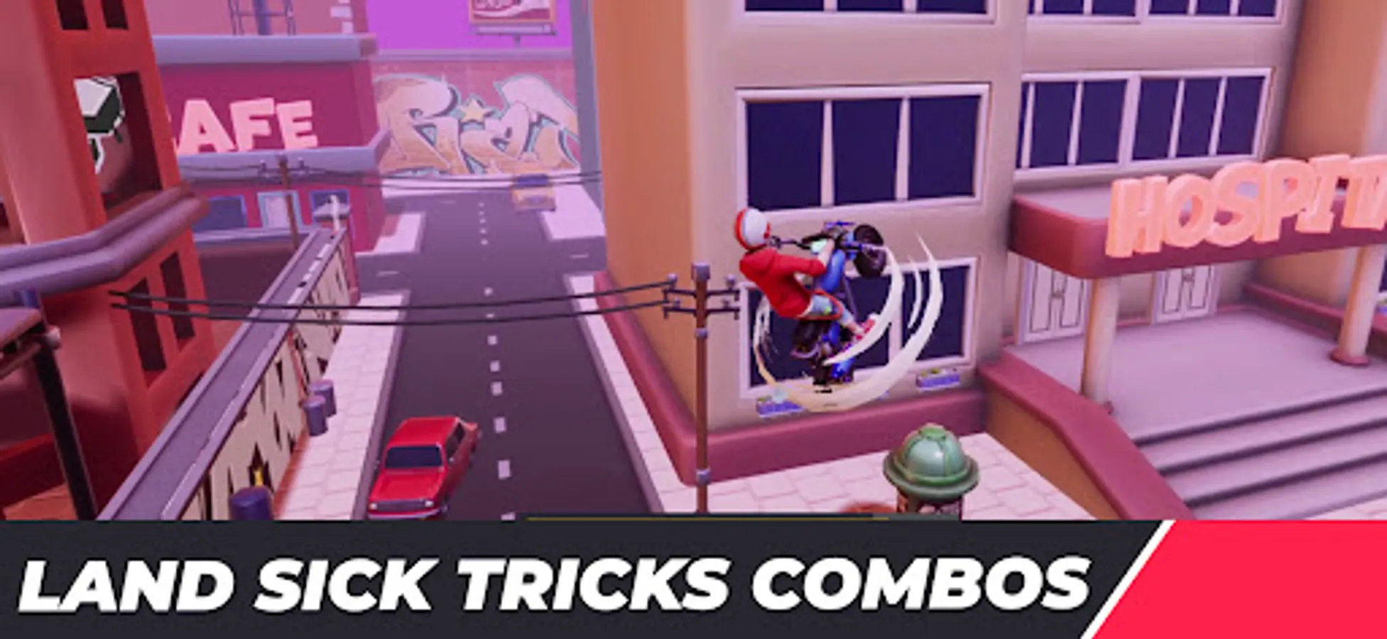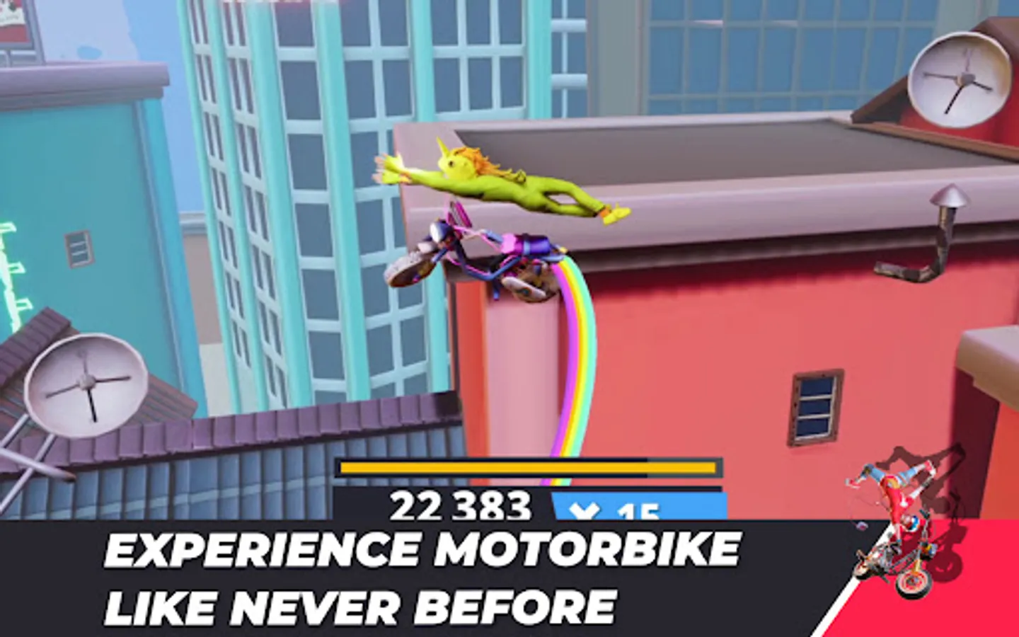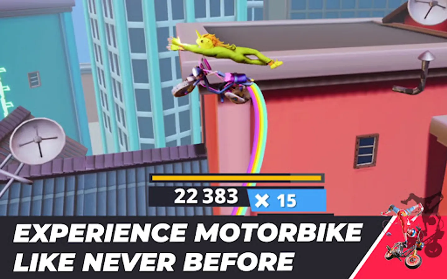 Grab your bike and pull off the most savage tricks and combos on your motorbike. Ride freely, spin around in the air, go back and forth and let yourself be carried away by the fun, fast-paced gameplay, colorful visuals, and smooth controls.