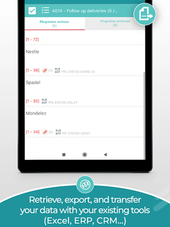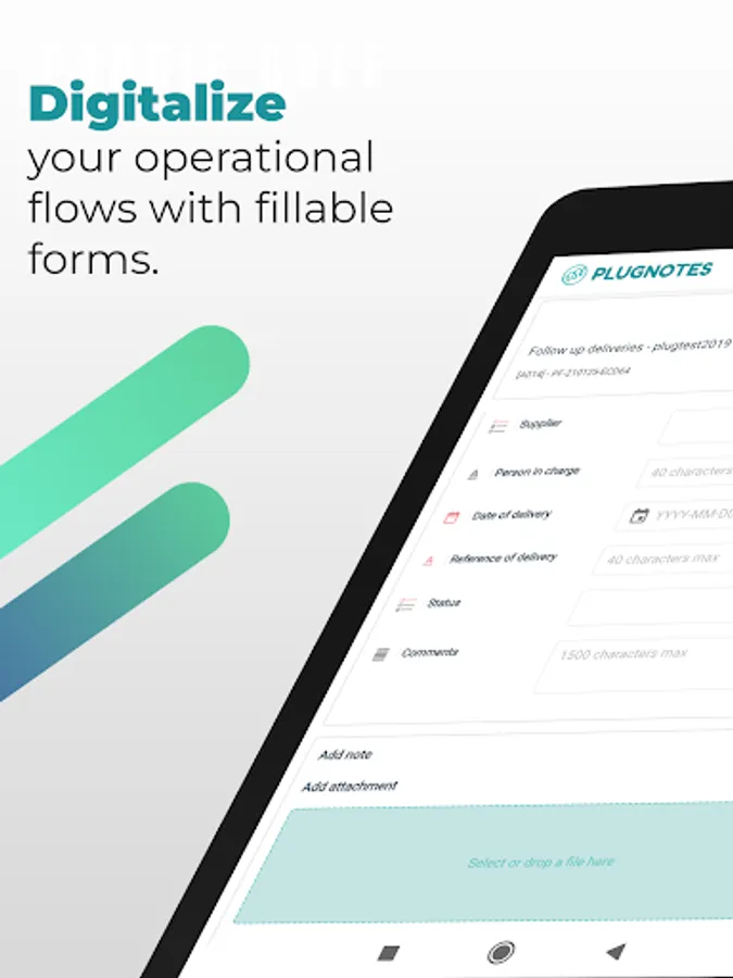 Plugnotes allows you to automate and digitize the operational flows of your SME. Thanks to our mobile application coupled with our web platform, create digital forms to capture information on the field. Our application integrates with all types of tools you already have in-house (Excel, ERP, CRM,...) without a single line of code.