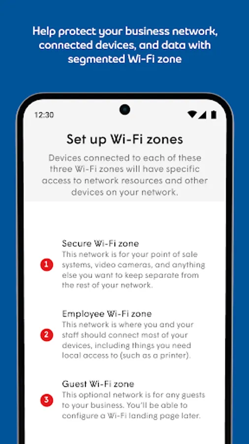 • Manage three distinct, password-protected Wi-Fi zones for business, employee, and guest devices