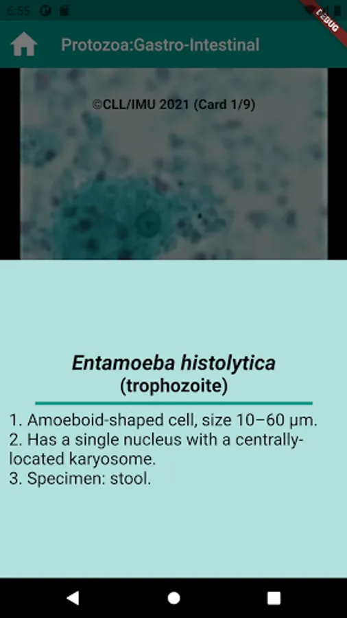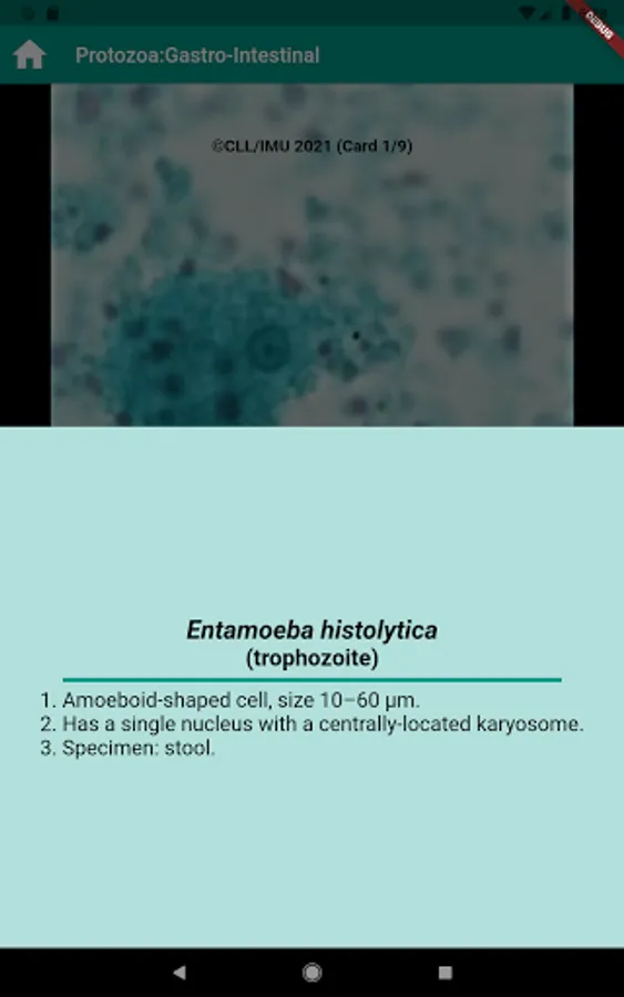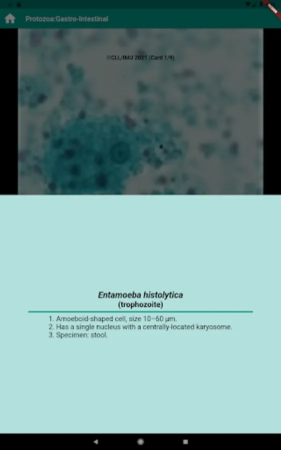 Due to the above reason, this app is created to facilitate the learners to be familiarised with the key microscopic characteristics of human parasites as observed in various specimens, including faecal material, blood, body fluid or tissue.
