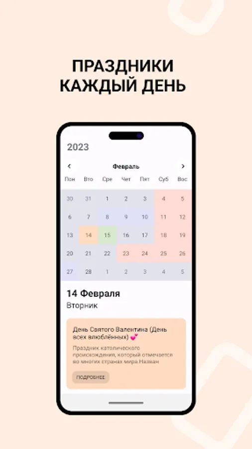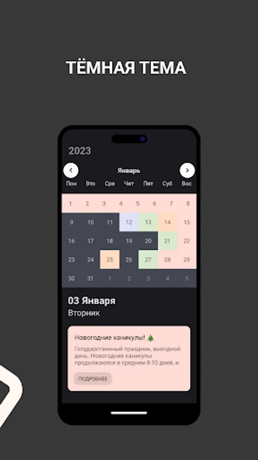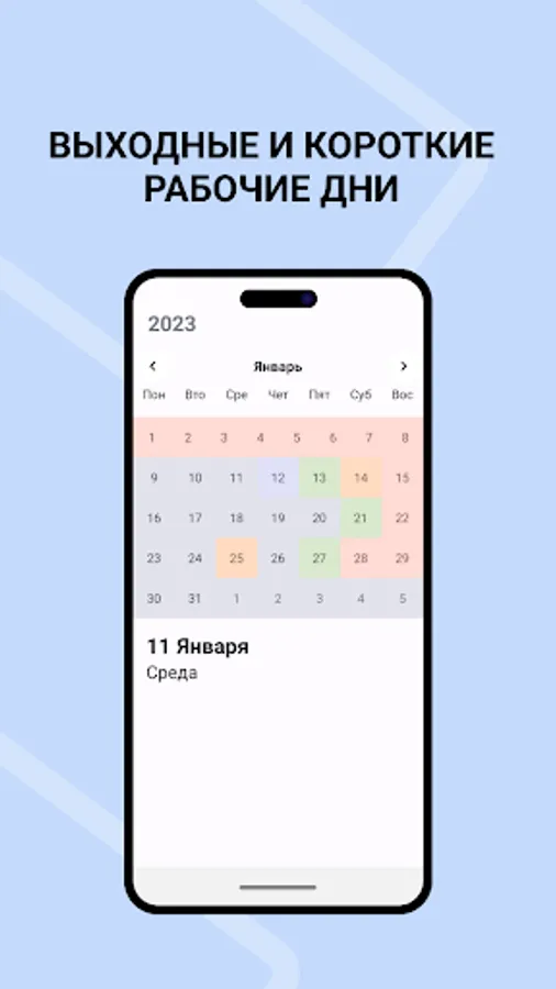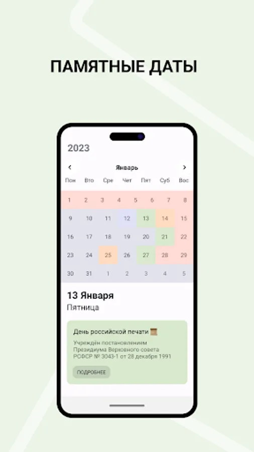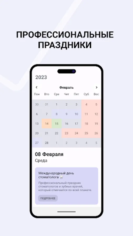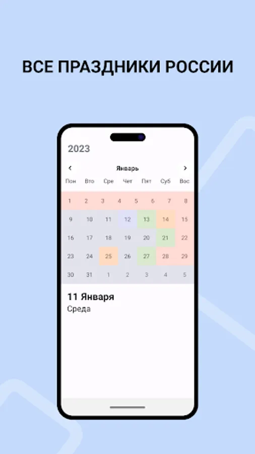 The application contains data on official holidays in Russia, anniversaries, professional holidays, shortened working days and public holidays.