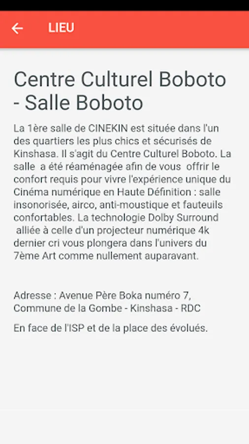 La philosophie de CINEKIN est d'offrir un nouveau loisir social en République Démocratique du Congo. Un véritables espace de vie, de confort, de culture, de rencontre et de divertissement qui se place au cœur de l’environnement urbain, dans des quartiers sécurisés, dynamiques et chaleureux. Afin de rendre le moment le plus agréable possible pour ses clients, CINEKIN propose des friandises et rafraichissements.