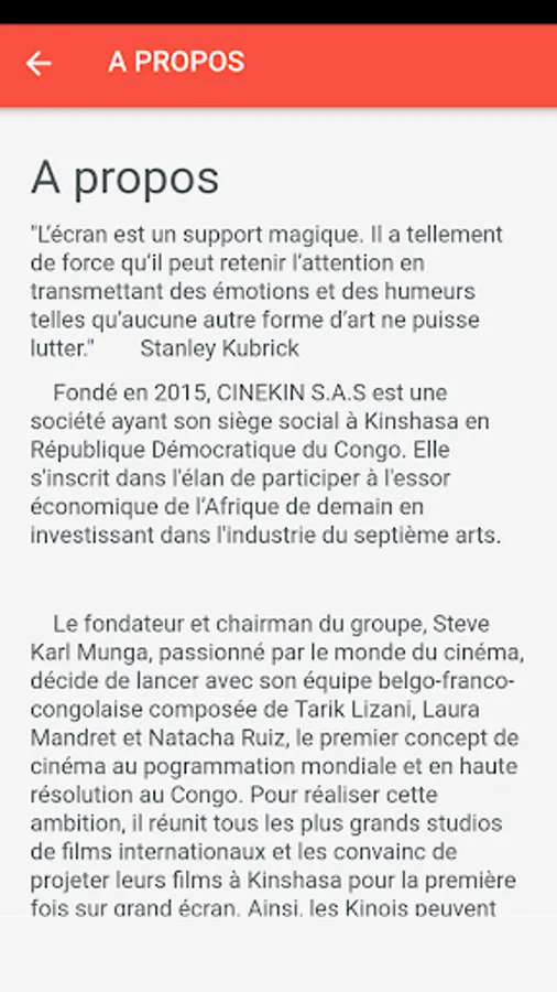 Le fondateur et chairman du groupe, Steve Karl Munga, passionné par le monde du cinéma, décide de lancer avec son équipe belgo-franco-congolaise composée de Tarik Lizani, Laura Mandret et Natacha Ruiz, le premier concept de cinéma au pogrammation mondiale et en haute résolution au Congo. Pour réaliser cette ambition, il réunit tous les plus grands studios de films internationaux et les convainc de projeter leurs films à Kinshasa pour la première fois sur grand écran. Ainsi, les Kinois peuvent vivre l'expérience magique qu'offre le cinéma haute qualité, l'une des industries les plus spectaculaires et importantes au monde.