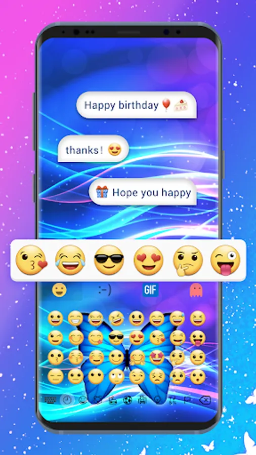 1.This Glitter Neon Butterfly Keyboard Theme uses iMore Emoji Keyboard.