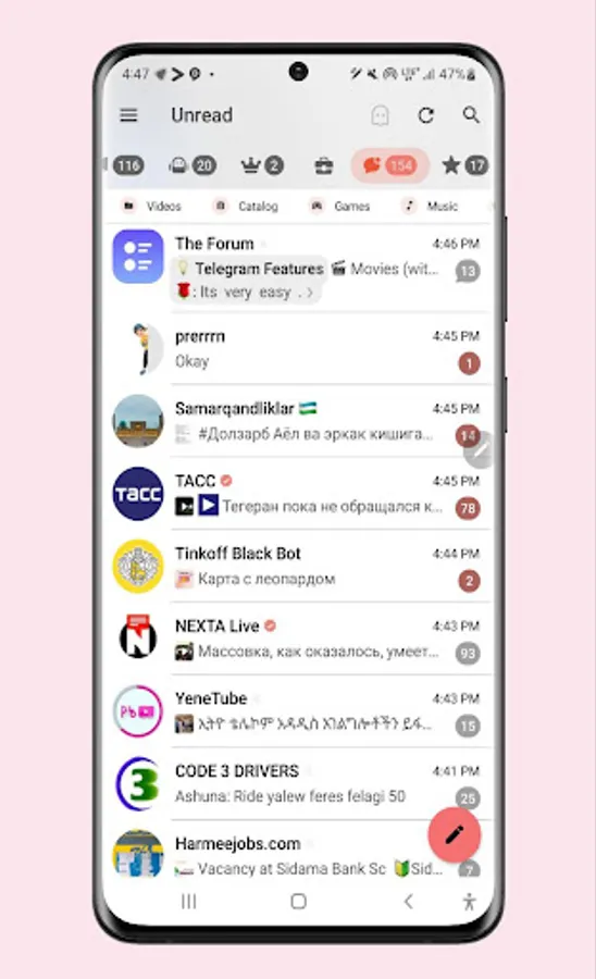 • Separated tabs for chats: users, groups, channels, bots, favorites, unread, admin/creator.