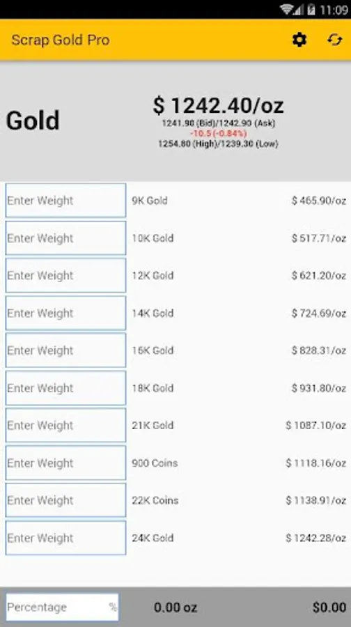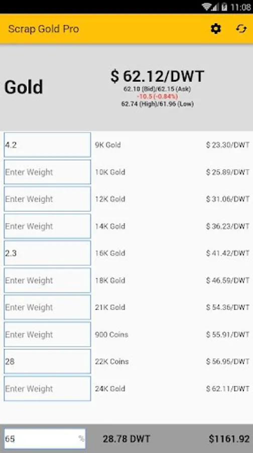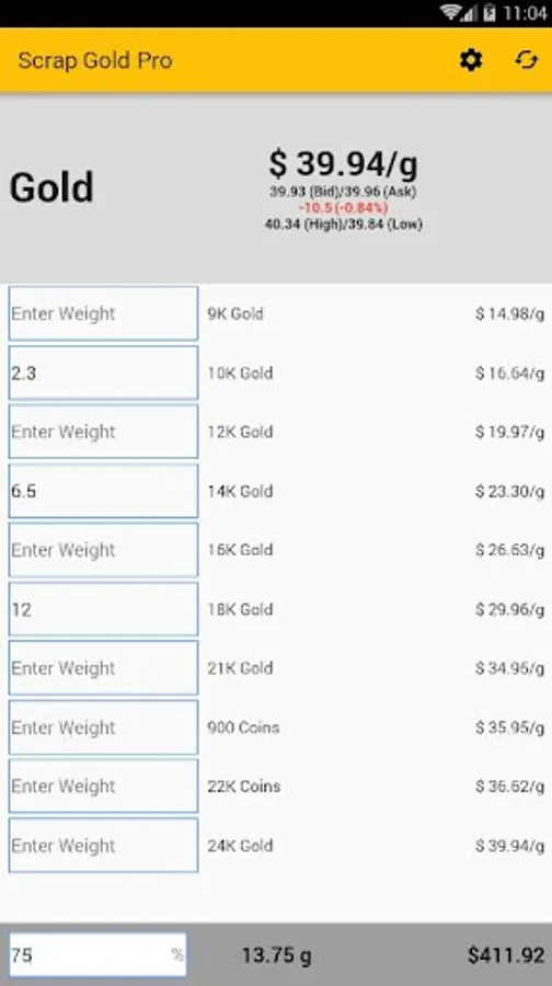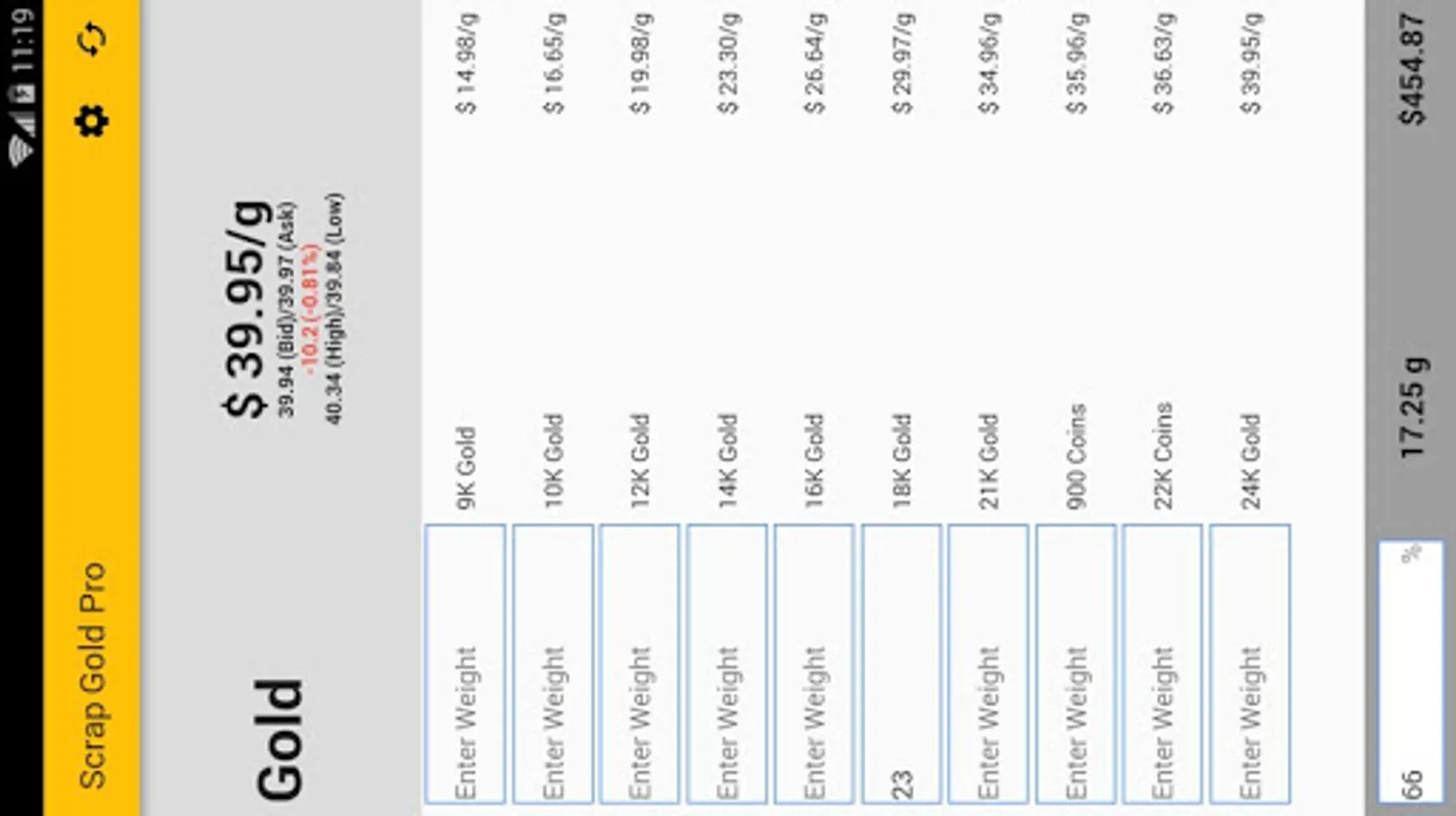 This app lets you type in various weights of karat gold, and it totals it up for you at the bottom right of the screen. You can change the percent "payout" at the bottom by changing the percentage at the bottom left of the screen. It's perfect for jewelry stores, pawn shops, and gold buyers. It's very simple and easy to use. The gold price is refreshed automatically when you re-open the app. The percentage is also saved even when you close the app.
