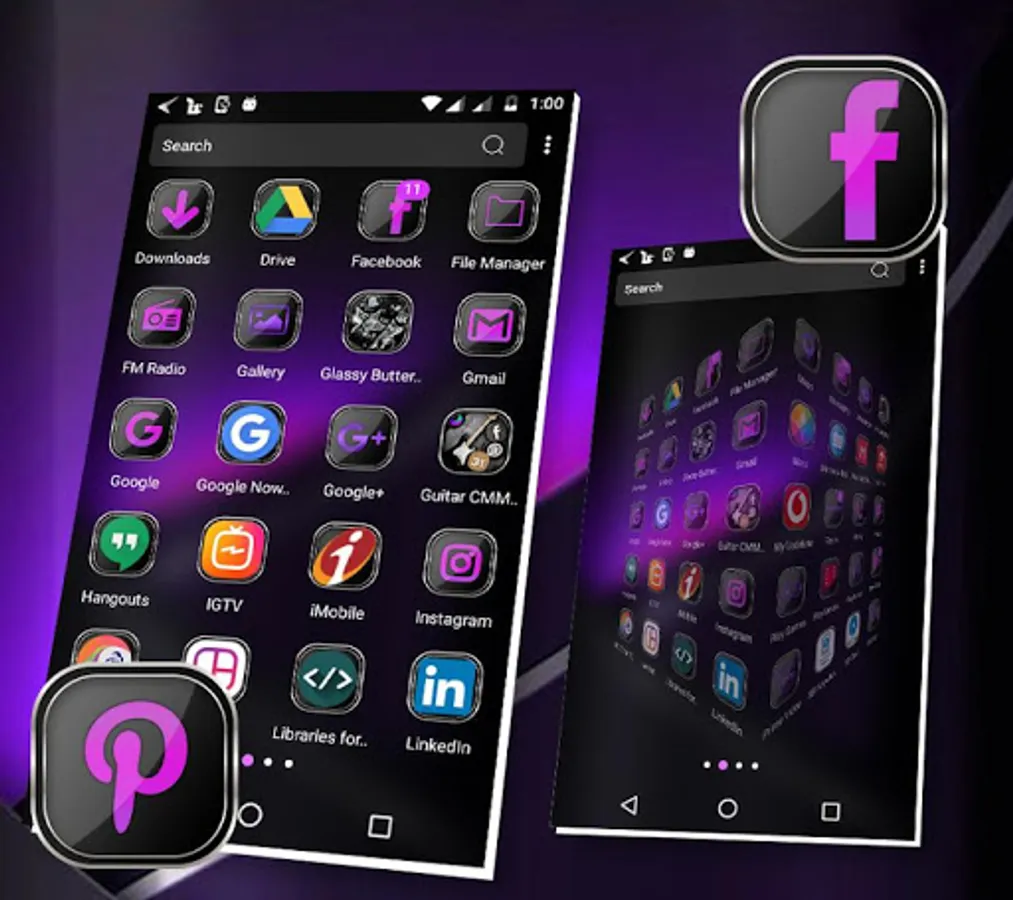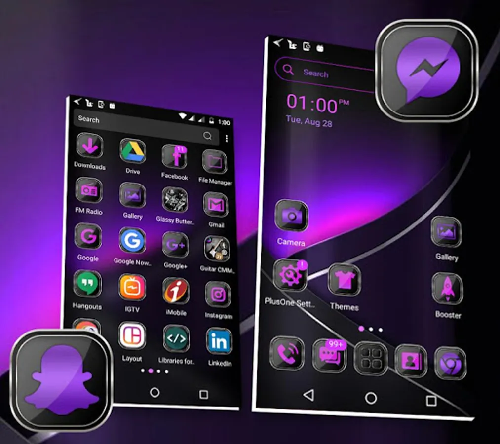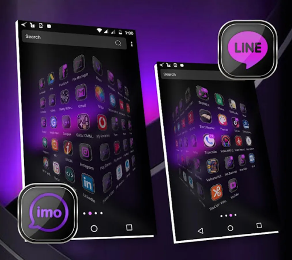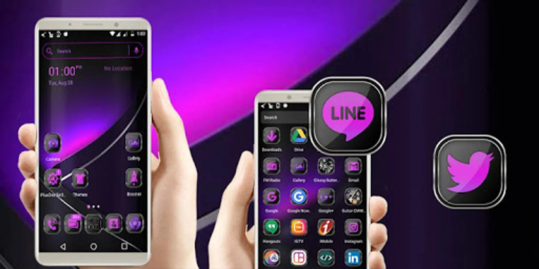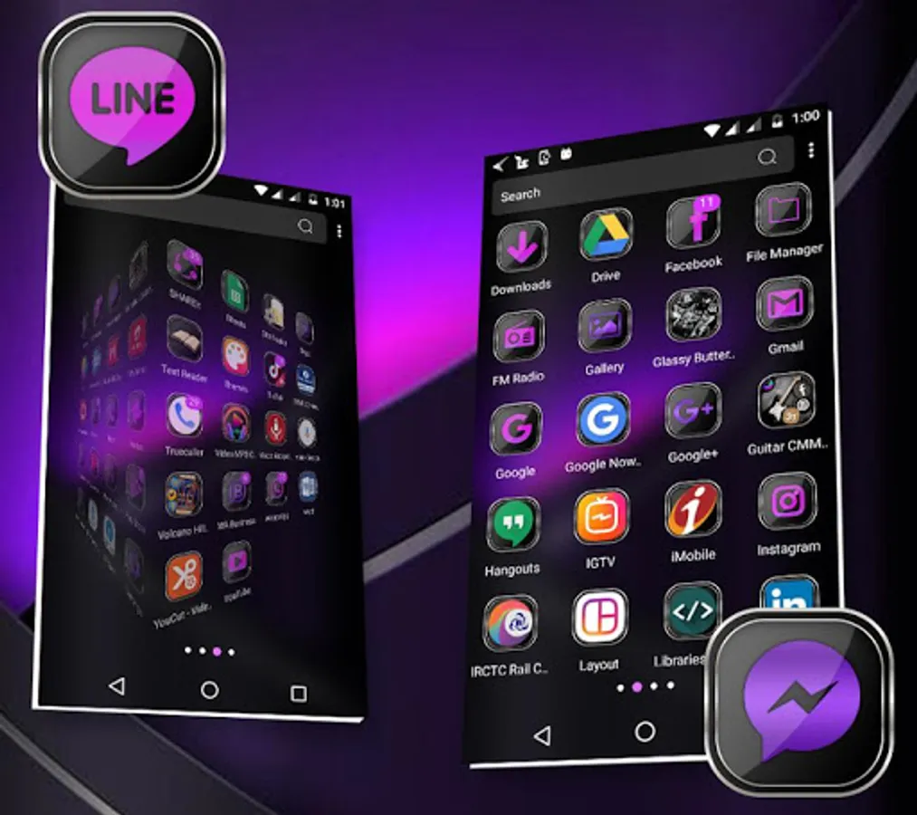 •Different launcher (icon packs) - Cool Purple Black HD Icon packs within theme to change the whole look of your phone Purple Black Theme,Icon pack of mostly used system apps, social chat app & other utility icons packs that suits with this Purple Black Launcher Theme.
