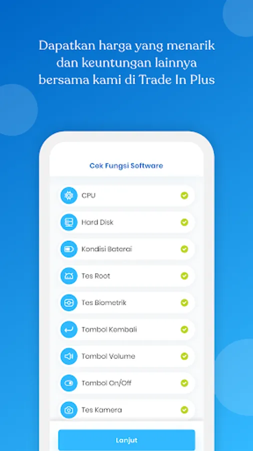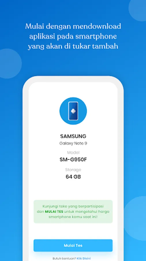 Aplikasi Trade in Plus membantu kamu untuk melakukan diagnosa dan valuasi smartphone kamu secara update & akurat serta memudahkan kamu untuk tukar tambah di toko-toko yang berpartisipasi.