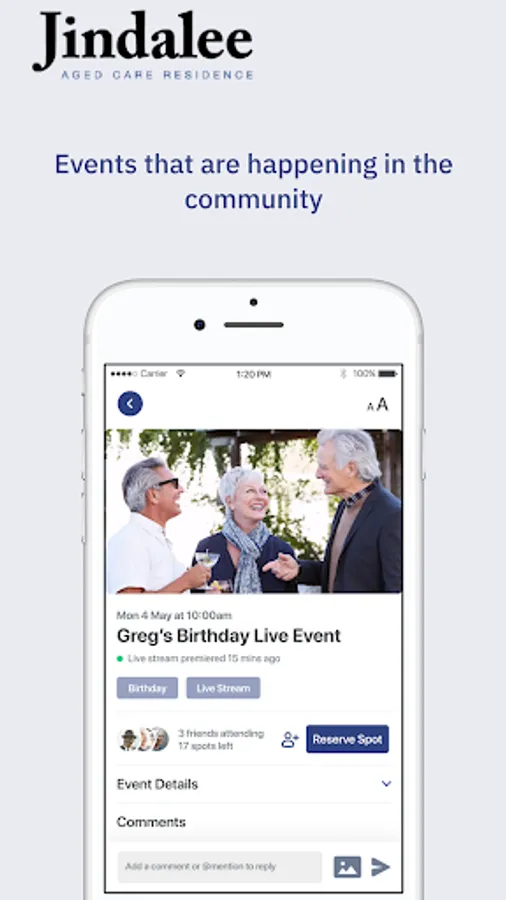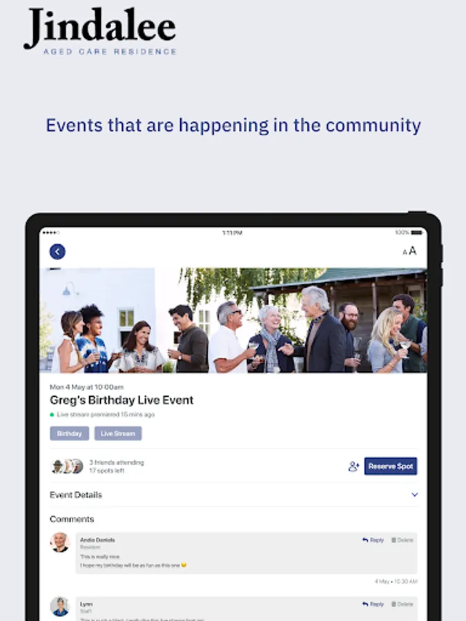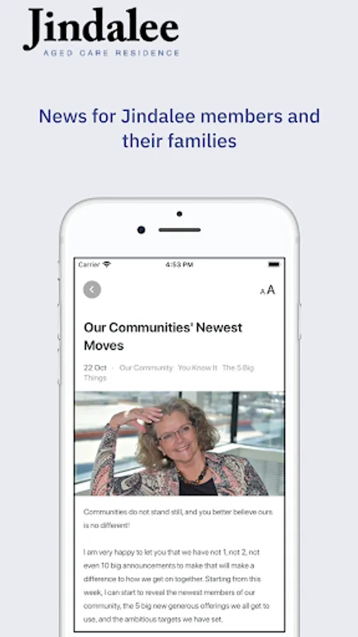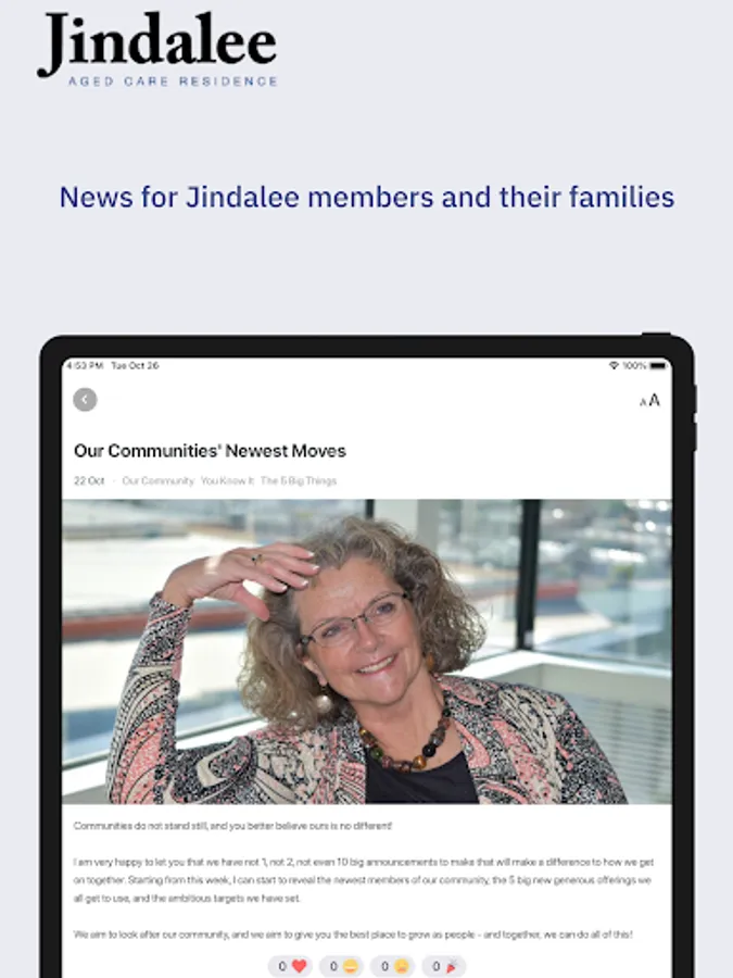 Welcome to Jindalee Aged Care Residence’s dedicated app for Staff, Residents and Families. Designed to connect the entire community. Jindalee’s central communication and notification hub offers a platform of information for important announcements and updates, events, news, and many other important features.