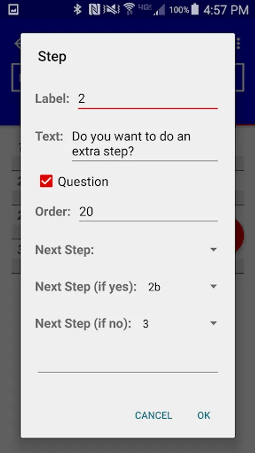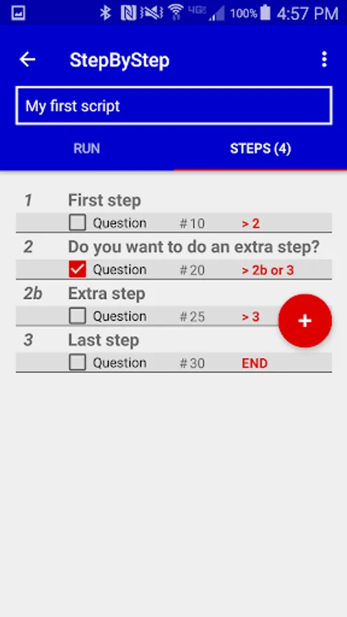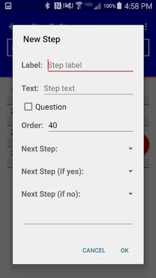 First, press the Plus button to add a script and give it a name. Then, add each step, specifying its label, text, order number and next step. If the step is a question, you can specify different next steps for the Yes and No answers. As you build the script, the steps appear in order in a list; you can add steps in the middle of the order, or tap and hold to delete a step.