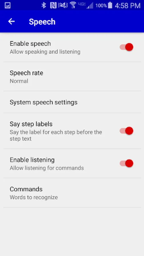 There are settings to control the language and speech rate, and you can specify new commands for Next, Back, Yes, No, Stop, Start and Done. You can turn off listening and just use the buttons to control your script, or turn off speech entirely for silent operation.