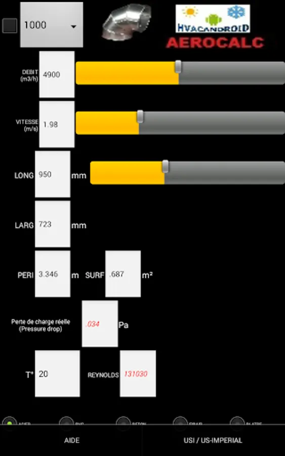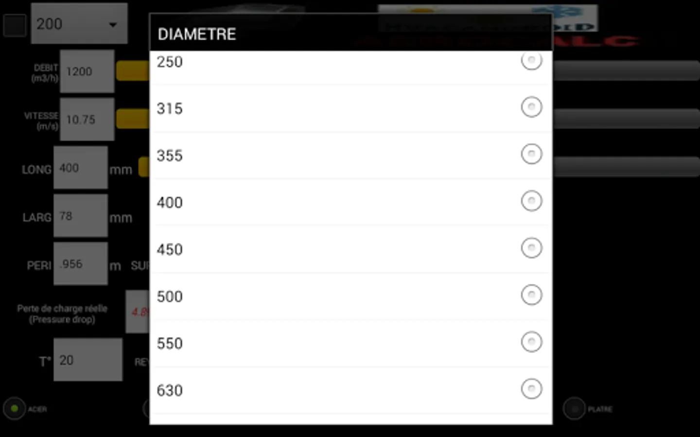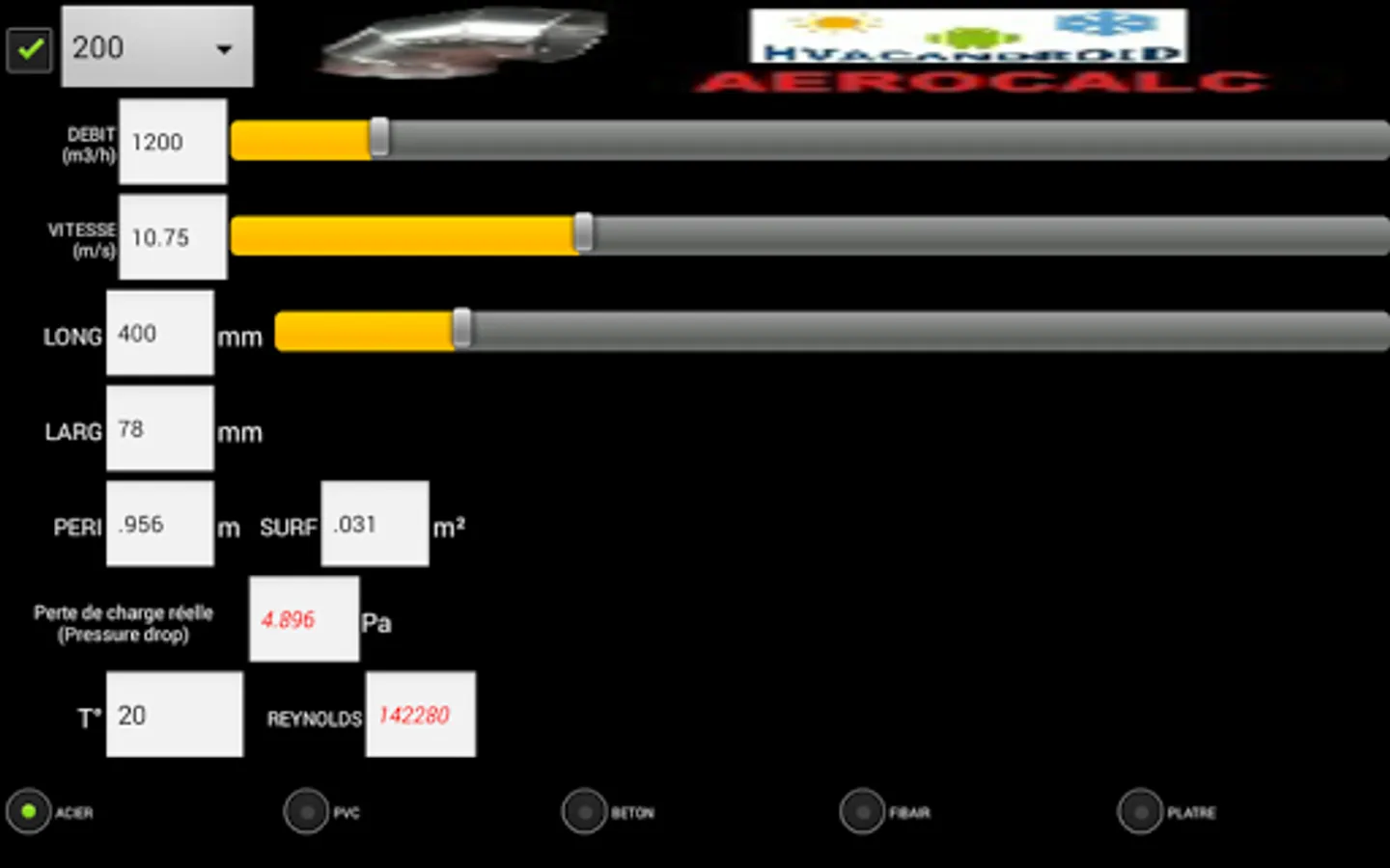Aeraulics calculator to calculate the diameter, the section, the perimeter, the pressure drop, flow and velocity in a steel sheath, plaster, fibair, PVC or concrete.